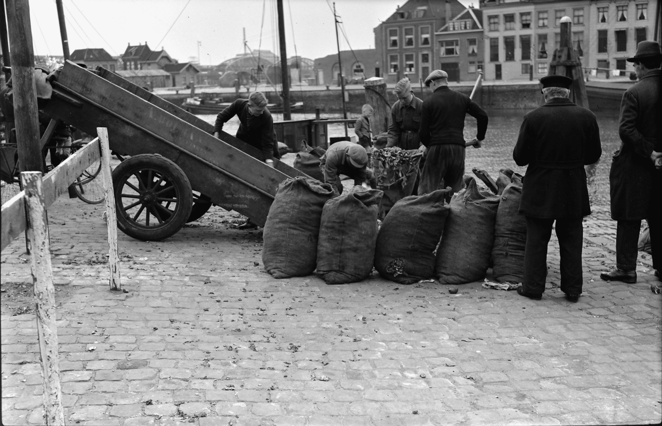 Arbeiders op het Achterhakkers bij de Kalkhaven, gezien in de richting van de Draai …