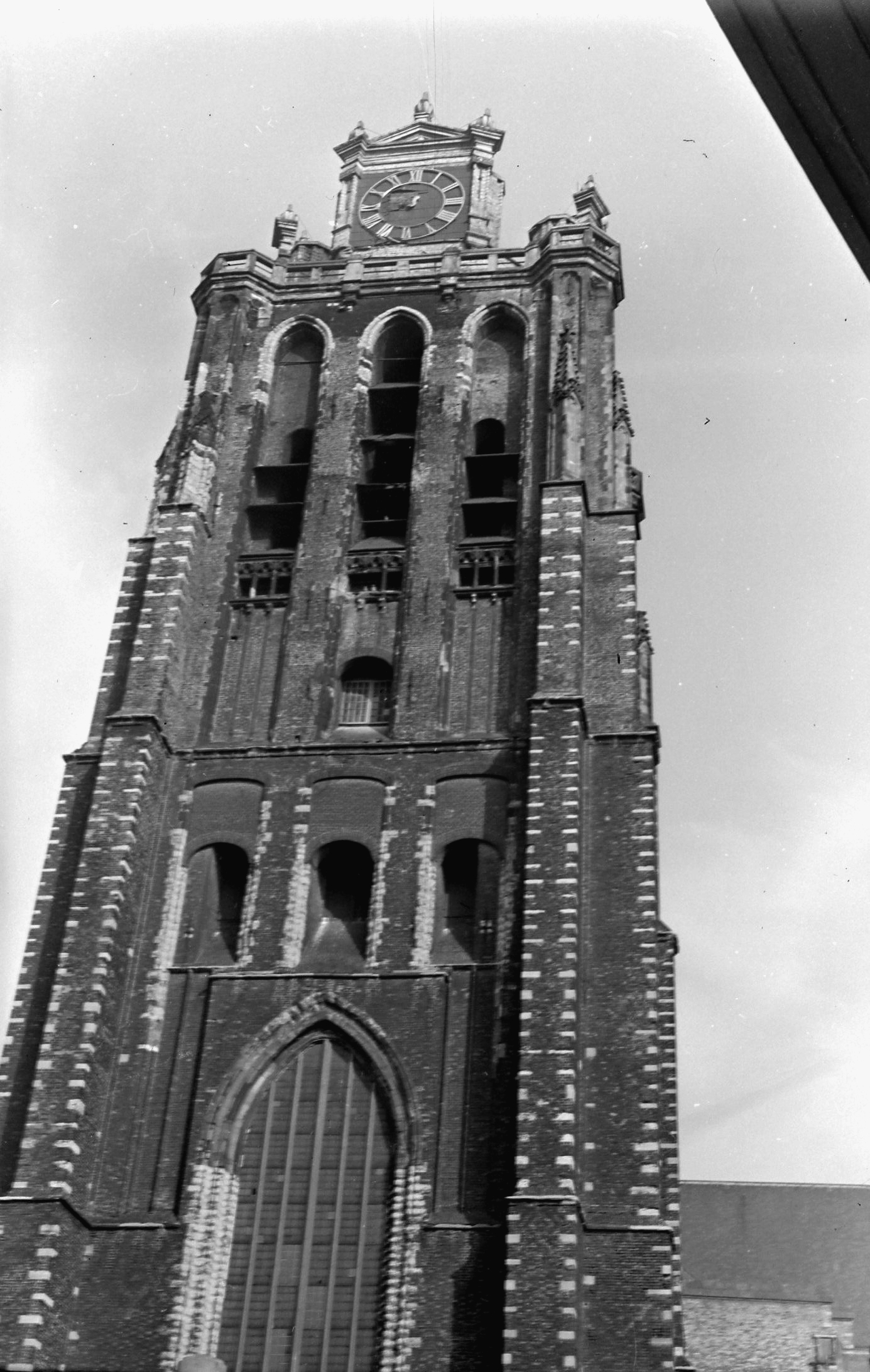 - Kapotgeschoten wijzerplaat van de Grote Kerk in de Tweede Wereldoorlog. Opname is dus in/na mei 1940. Oorlogsschades.
