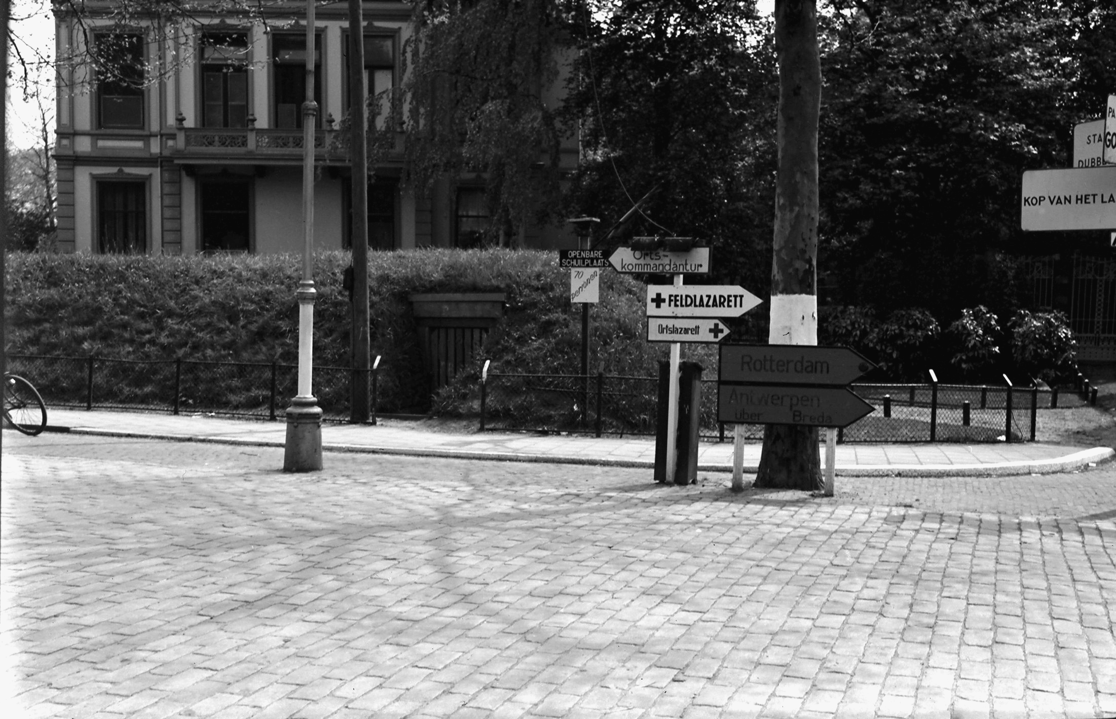 Detail: de i.v.m. de verduistering (tijdens de Duitse bezetting) wit geschilderde boom en lantaarnpaal. Ook de openbare schuilkelder (met plaats voor 70 personen) is in het donker te vinden door de wit geschilderde koppen van de hekpaaltjes bij de ingang.