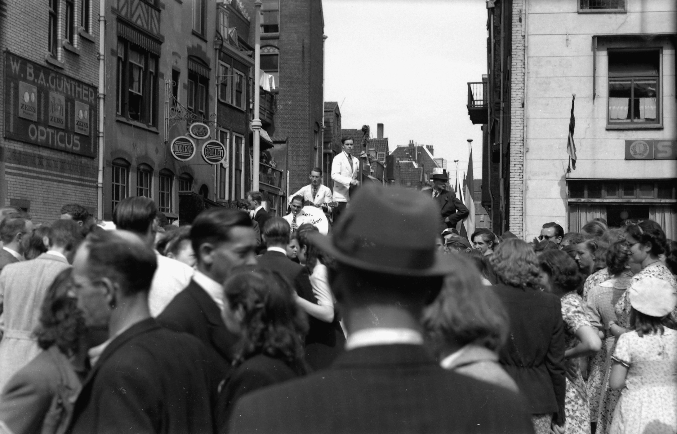 Op de Visbrug tussen café Pols (recht) en opticiën Günther speelde kort na de bevrijding een bandje.
