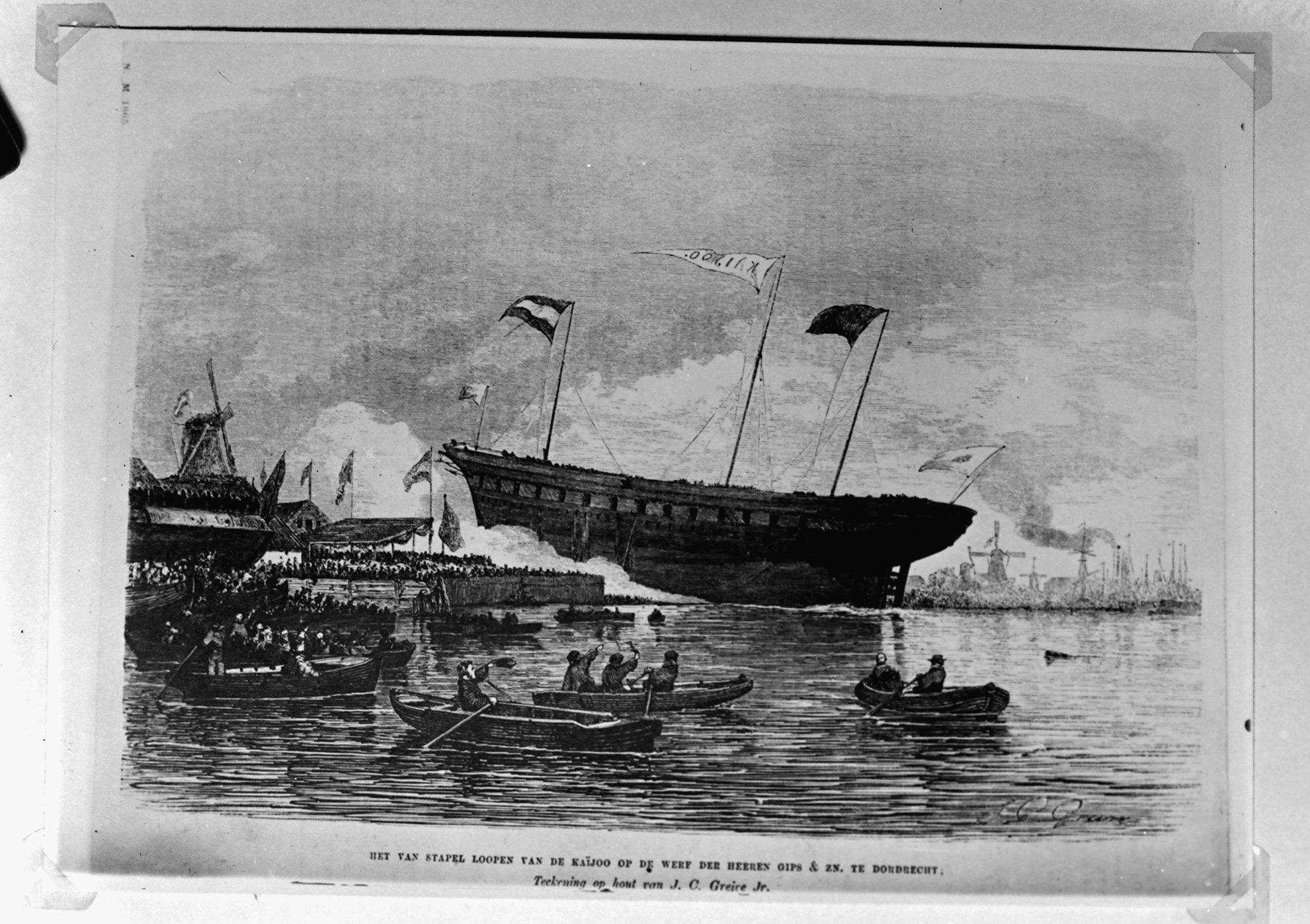 - Houtsnede van het van stapel lopen van het Japanse oorlogsschip Kaïjo op de werf van C. Gips & Zonen nabij de Riedijkshaven.