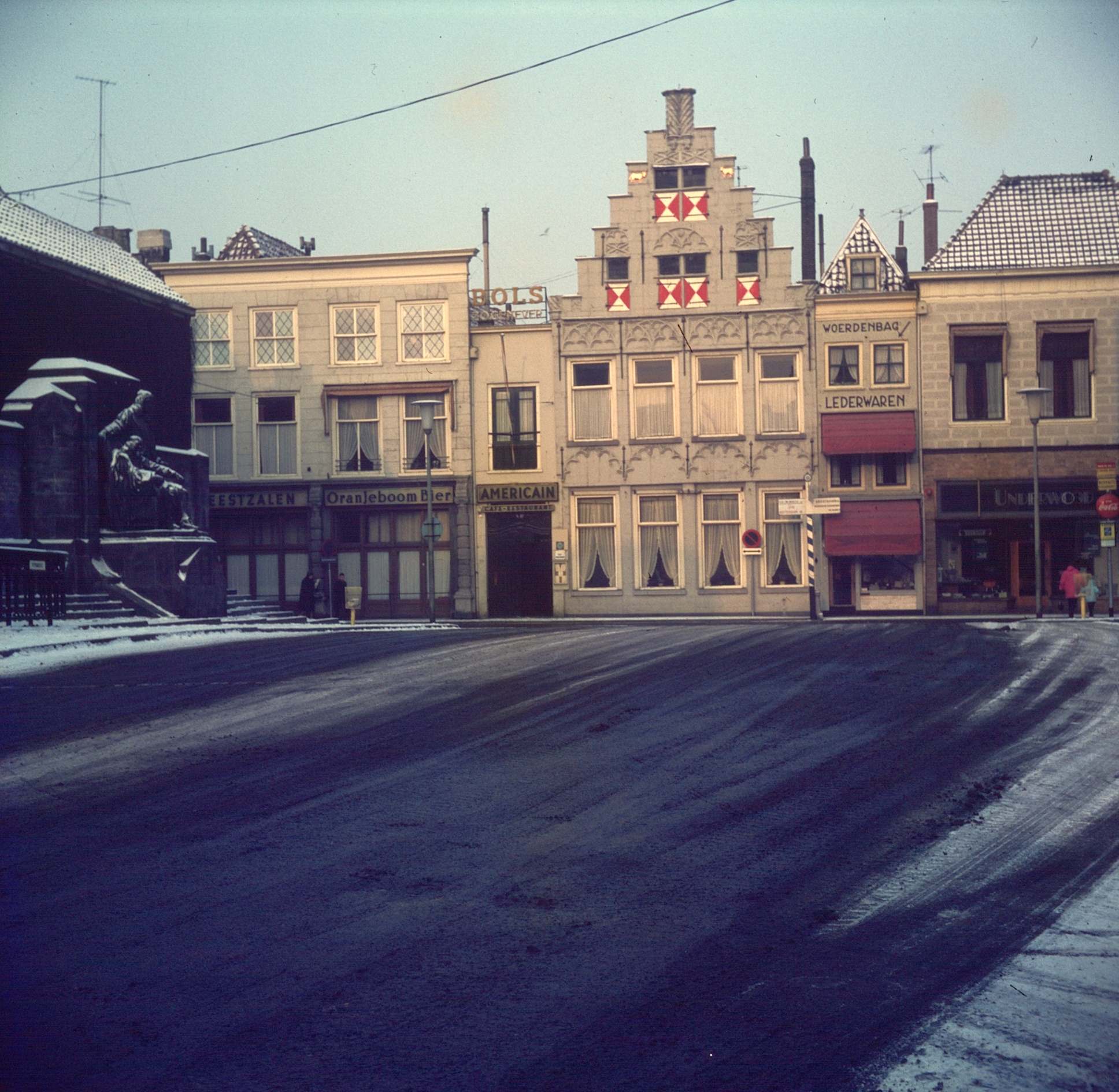 Gezicht, vanaf de Visstraat, op de Groenmarkt met centraal het huis 'de Vergulde Os', links van dit pand café-restaurant Americain, aan de rechterkant is Woerdenbach Lederwaren gevestigd; geheel links het standbeeld van de gebroeders de Witt.