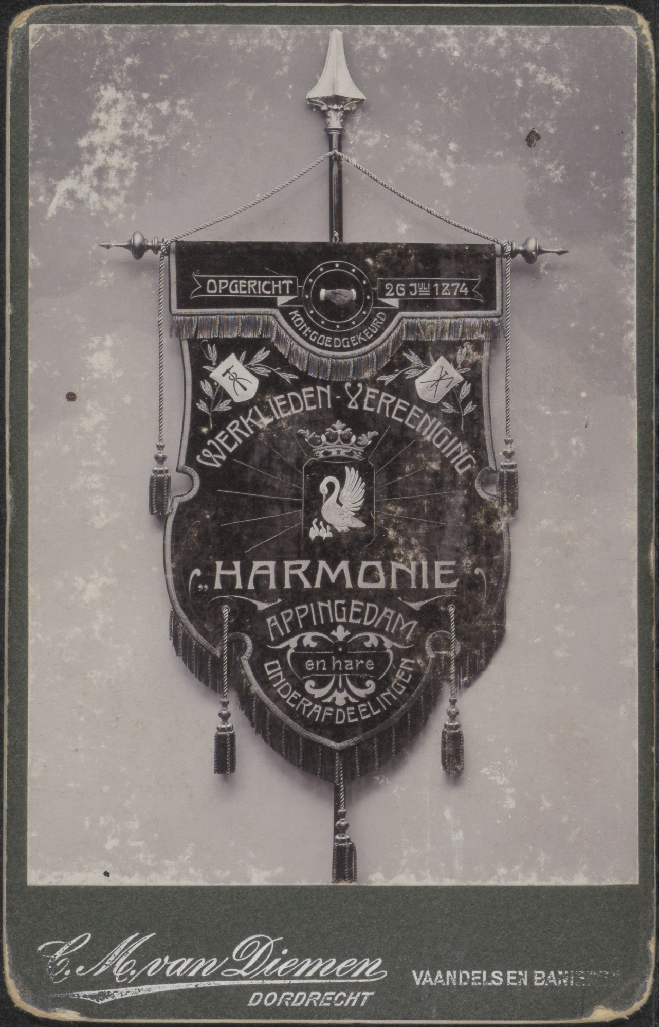 Een vaandel van de Werkliedenvereniging "Harmonie" Appingedam en hare onderafdelingen; opgericht 28 juli 1874.