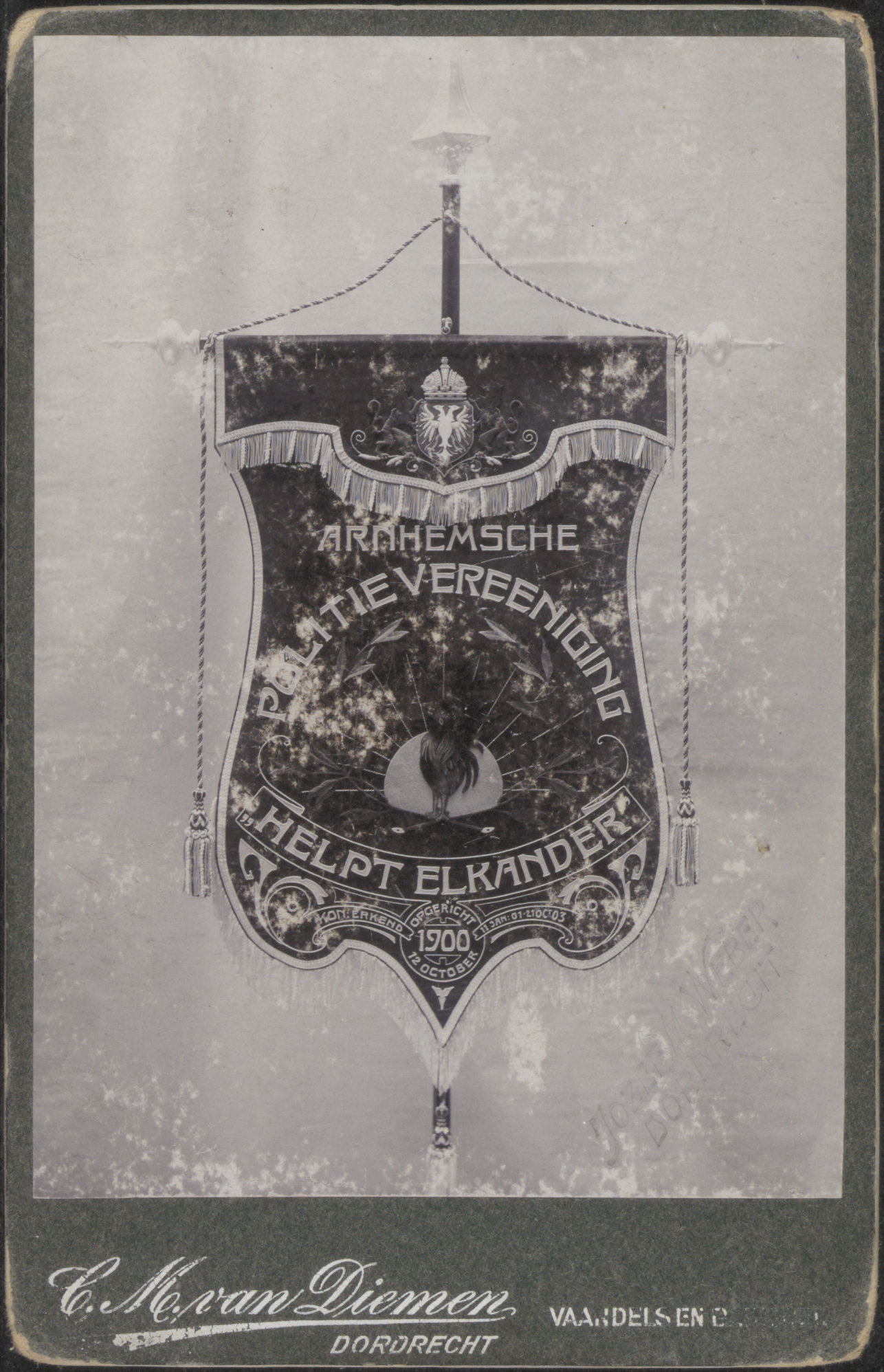 - Een vaandel van de Arnhemsche Politievereeniging "Help Elkander", opgericht 12 oktober 1900.