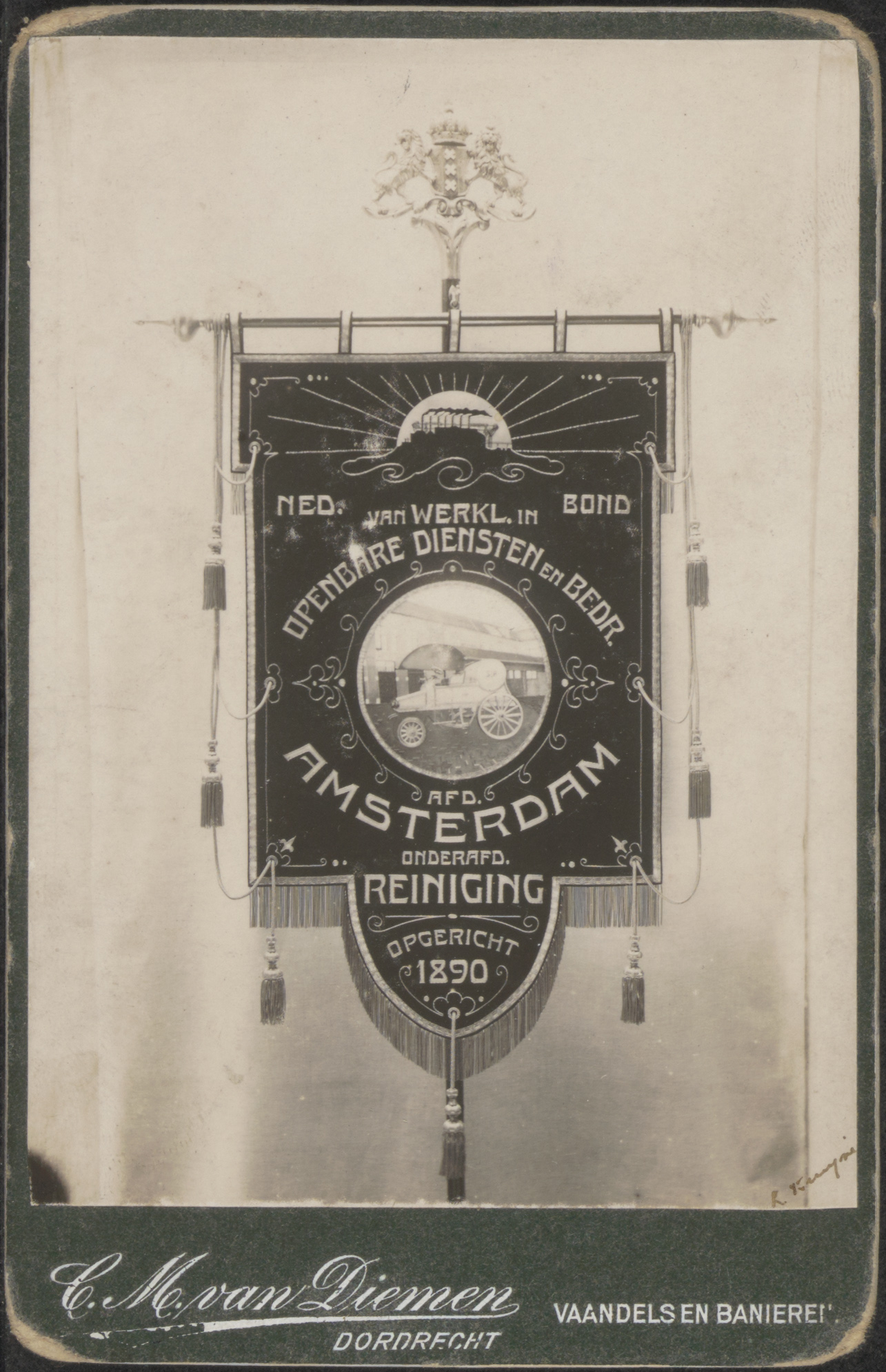 - Een vaandel van de Nedrelandse bond van openbare diensten en bedrijven, afd Amsterdam, onderafd. reiniging; opgericht 1890.