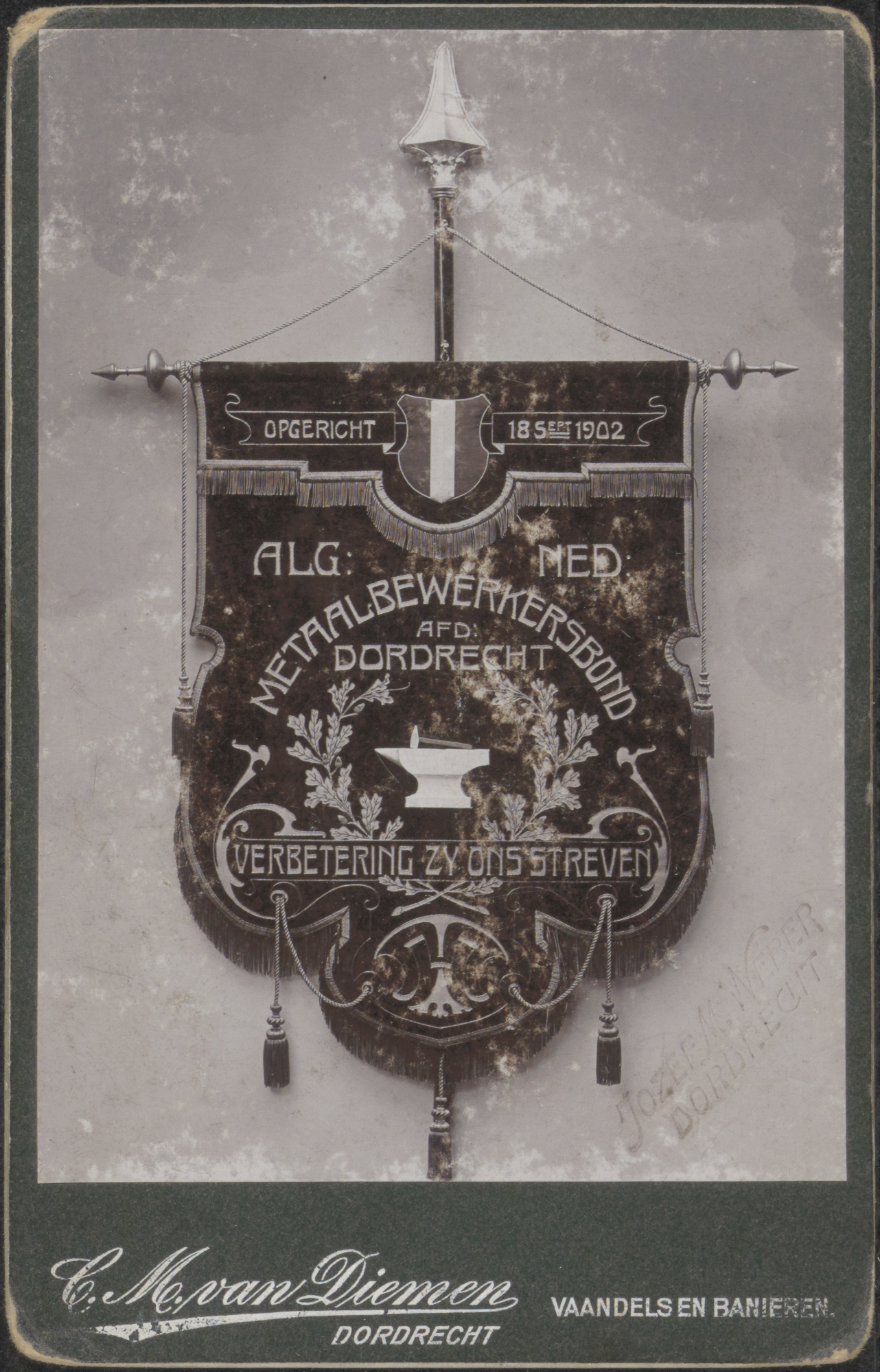 - Een vaandel van de Algemene Nederlandse Metaalbewerkersbond, afd. Dordrecht, "Verbetering zij ons - Streven "; opgericht 18 september 1902.