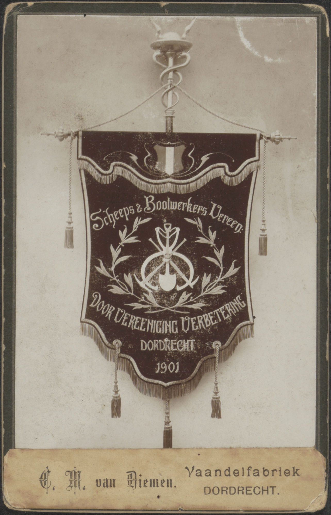 - Een vaandel van de Boot- en Scheepswerkersvereeniging "Door Vereeniging - Verbetering" afd. Dordrecht, 1901.