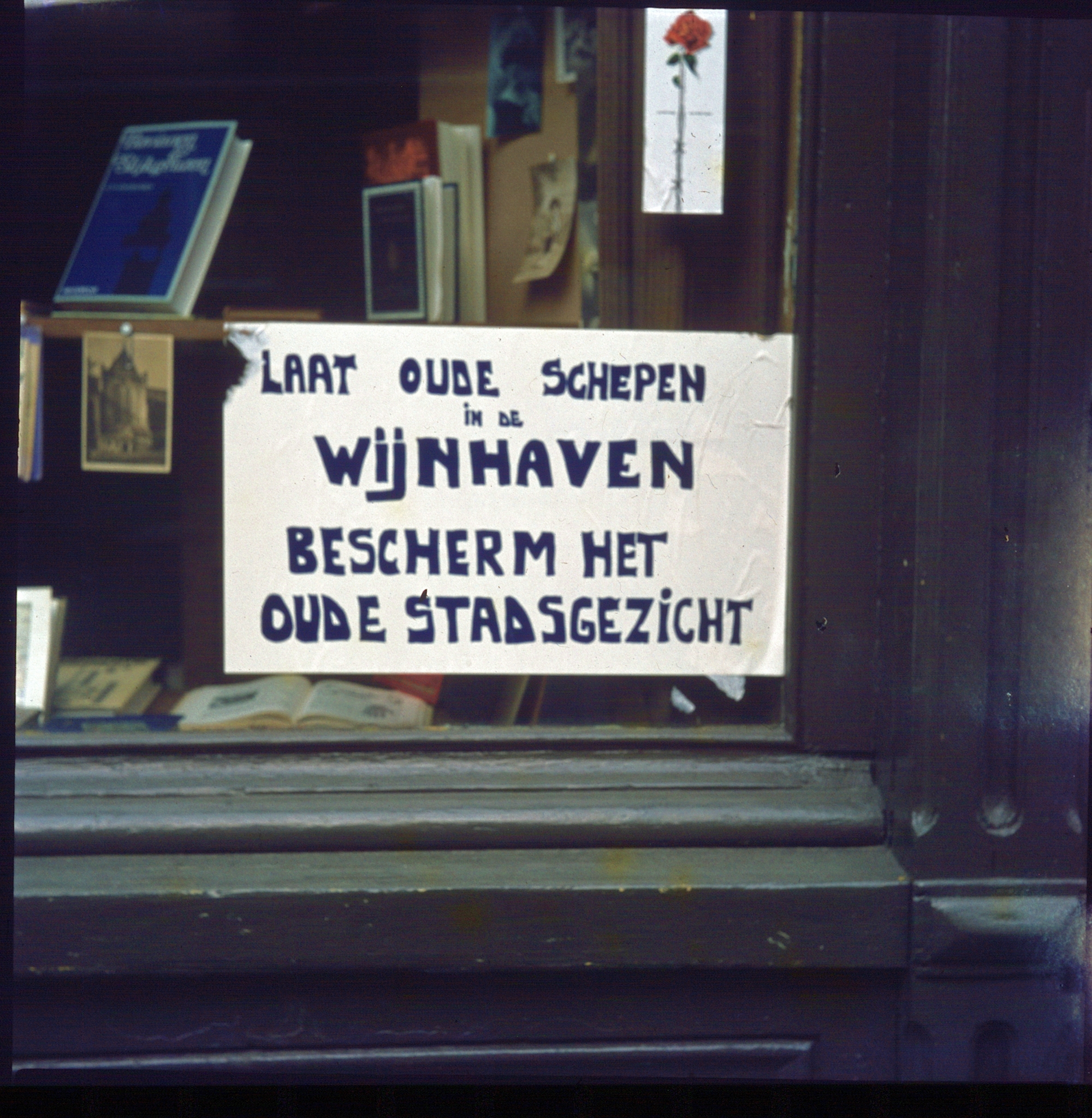 - Protest-affiche in de etalage van Boekhandel en Antiquariaat Oud-Dordrecht.