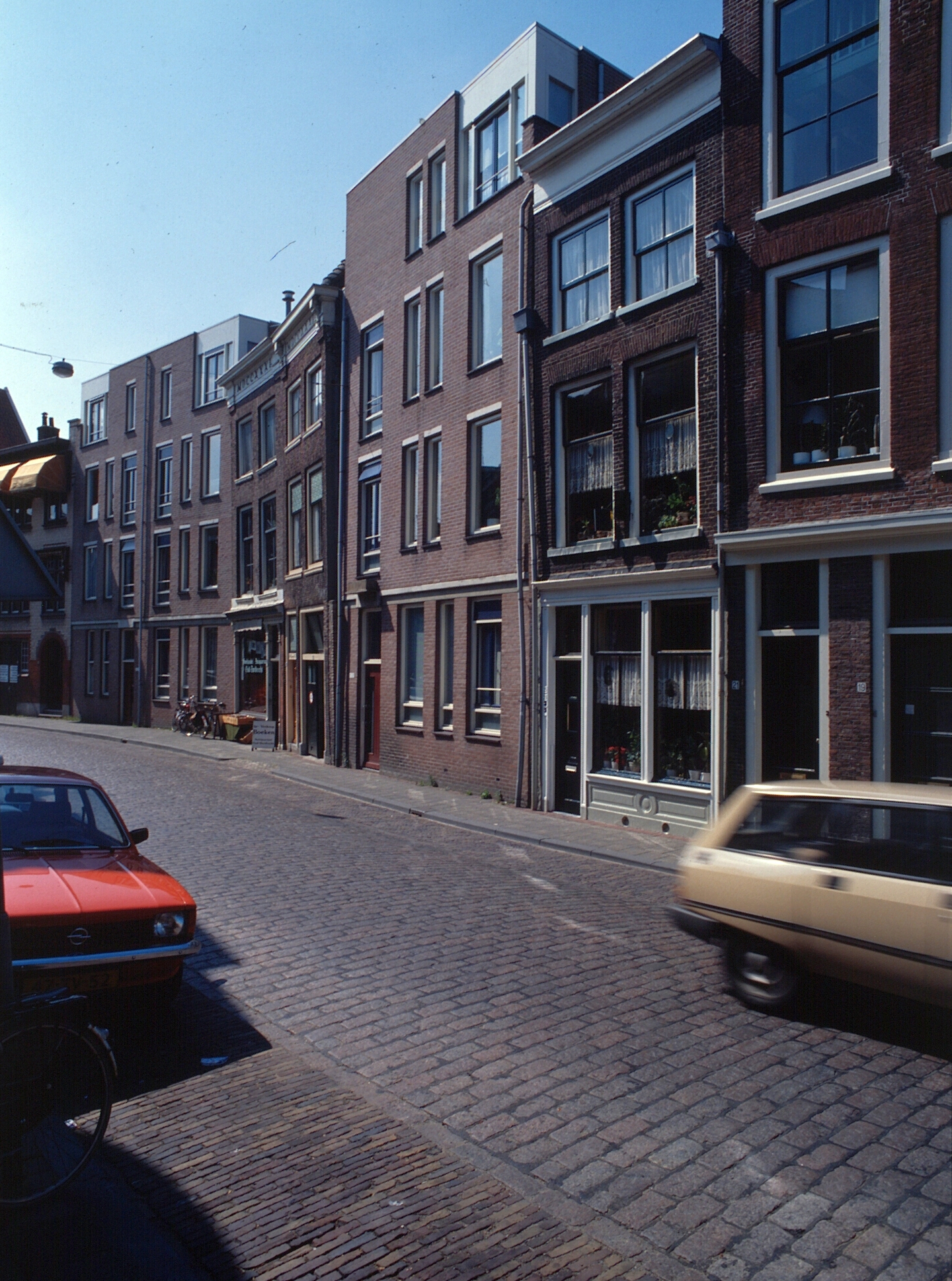 - De Wijnstraat met aan de rechterkant nieuwbouwcomplexen en daartussenin Boekhandel Antiquariaat Oud Dordrecht.
