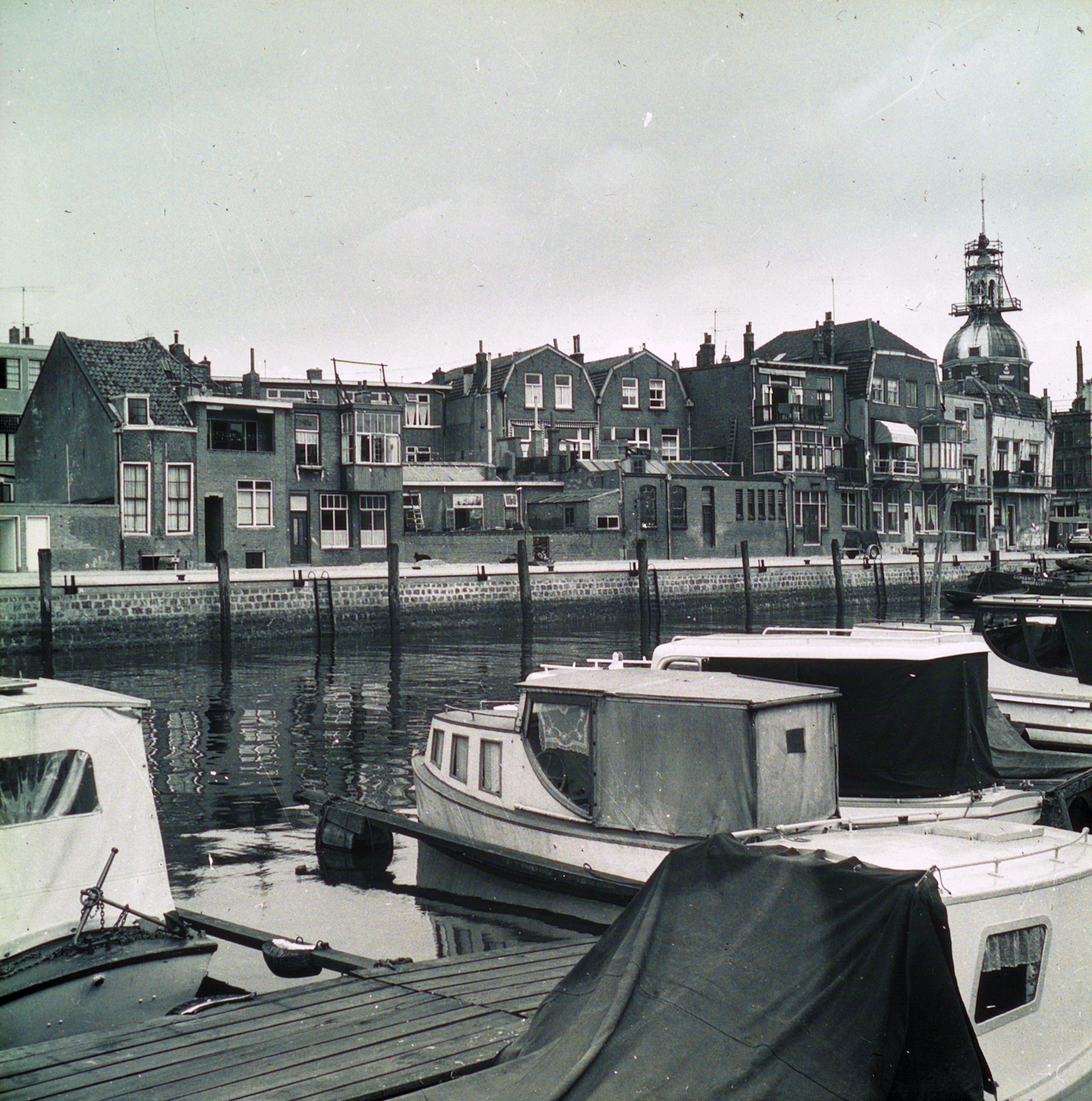 De Wijnhaven met bootjes gezien vanaf de Taankade, aan de overkant de Mattenkade met de achterkant van de huizen die aan de Wijnstraat staan. Geheel rechtsboven de Groothoofdstoren in de steigers wegens de renovatie.