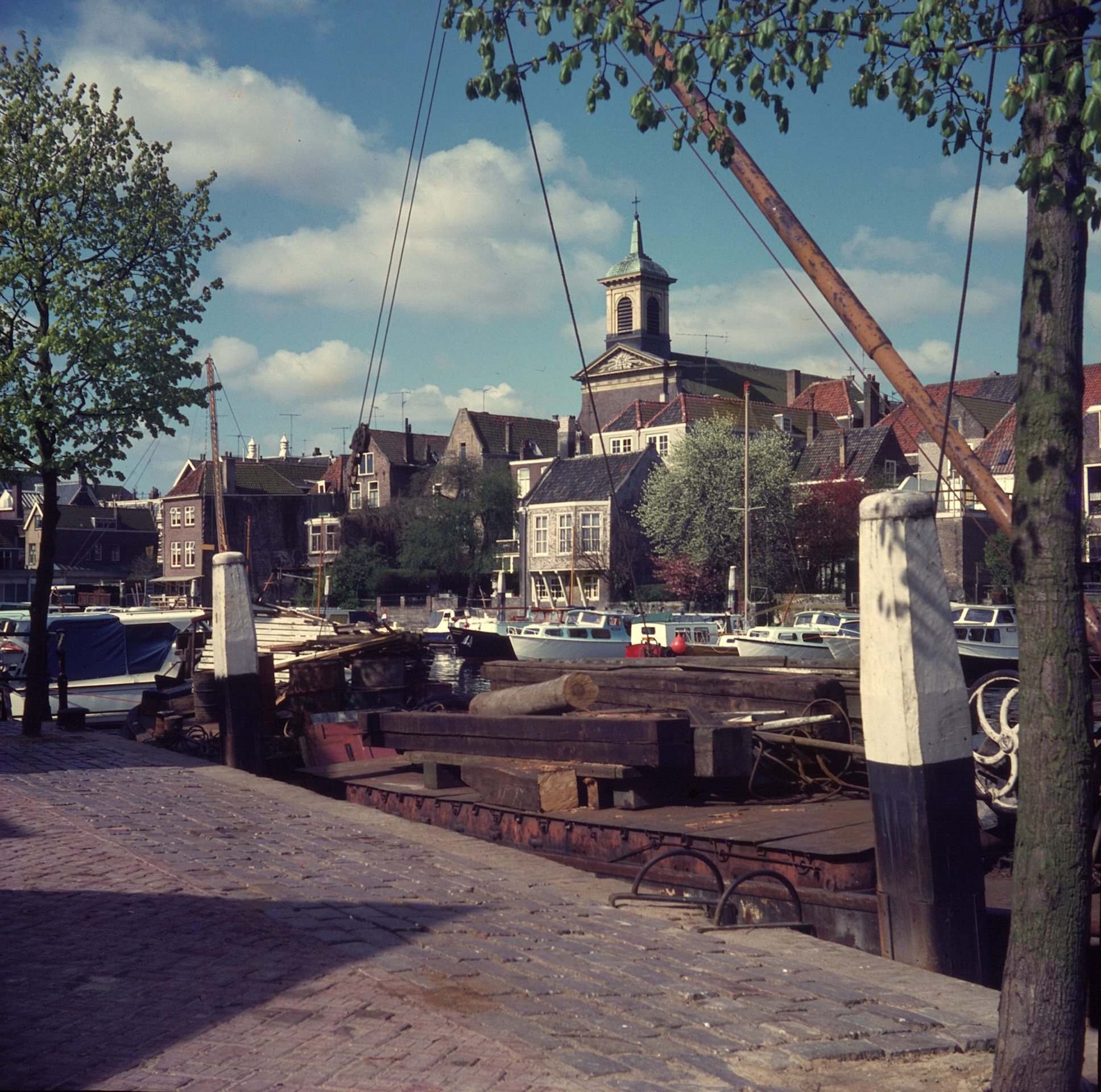 Een vrachtschip met hout in de Wijnhaven langs de Taankade aangemeerd; aan de overkant de Mattenkade met de achterkant van de huizen die aan de Wijnstraat staan. Daarboven de toren van de Bonifatiuskerk.