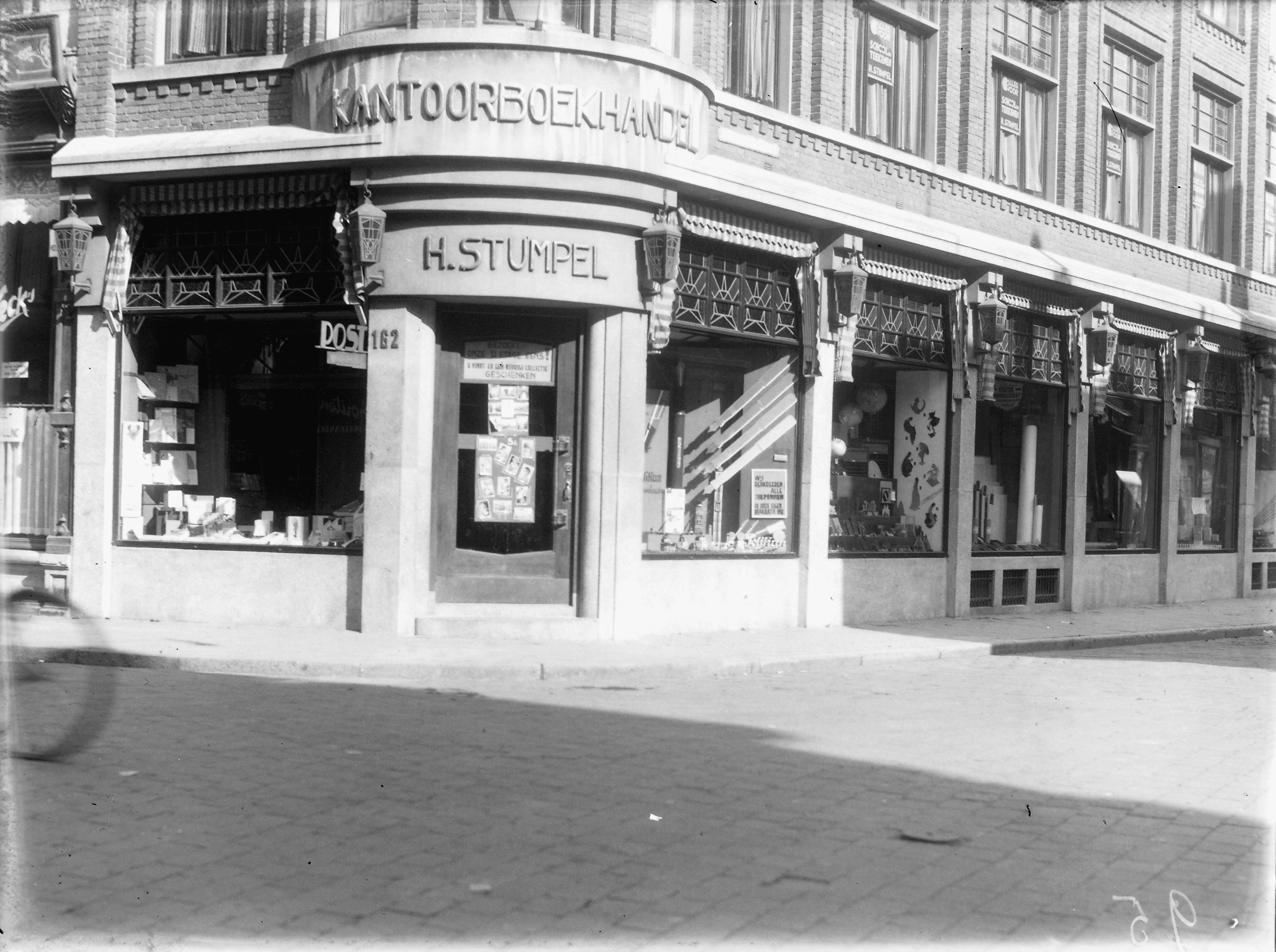 Pand van kantoorboekhandel Stumpel op de hoek Voorstraat/Steegoversloot (rechts).