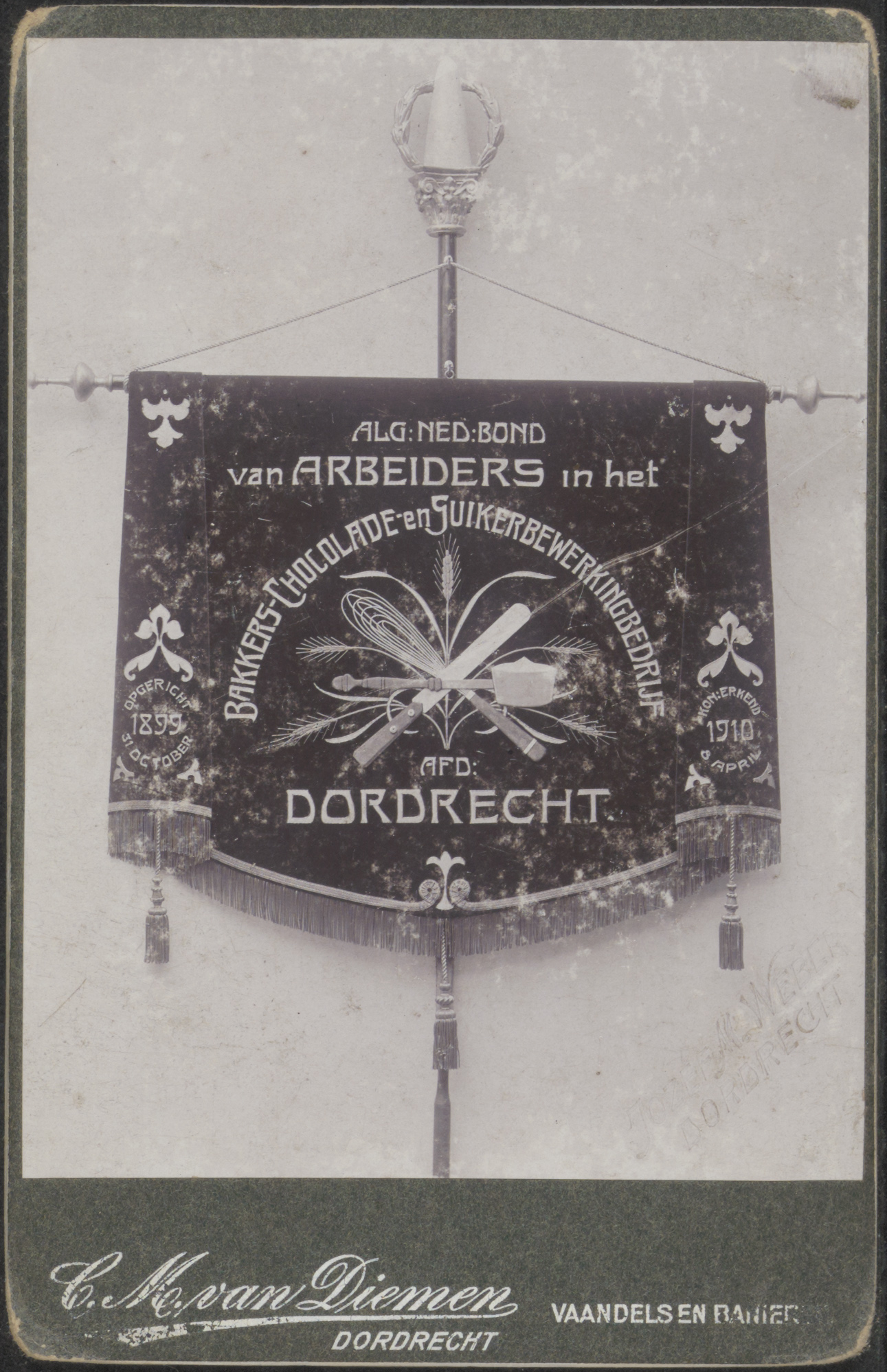 - Een vaandel van de Algemene Nederlandse Bond van arbeiders in het bakkers, chocolade en suikerbewerkingsbedrijf, afd. Dordrecht; opgericht 31 oktober 1899, koninklijk erkend 8 april 1910.