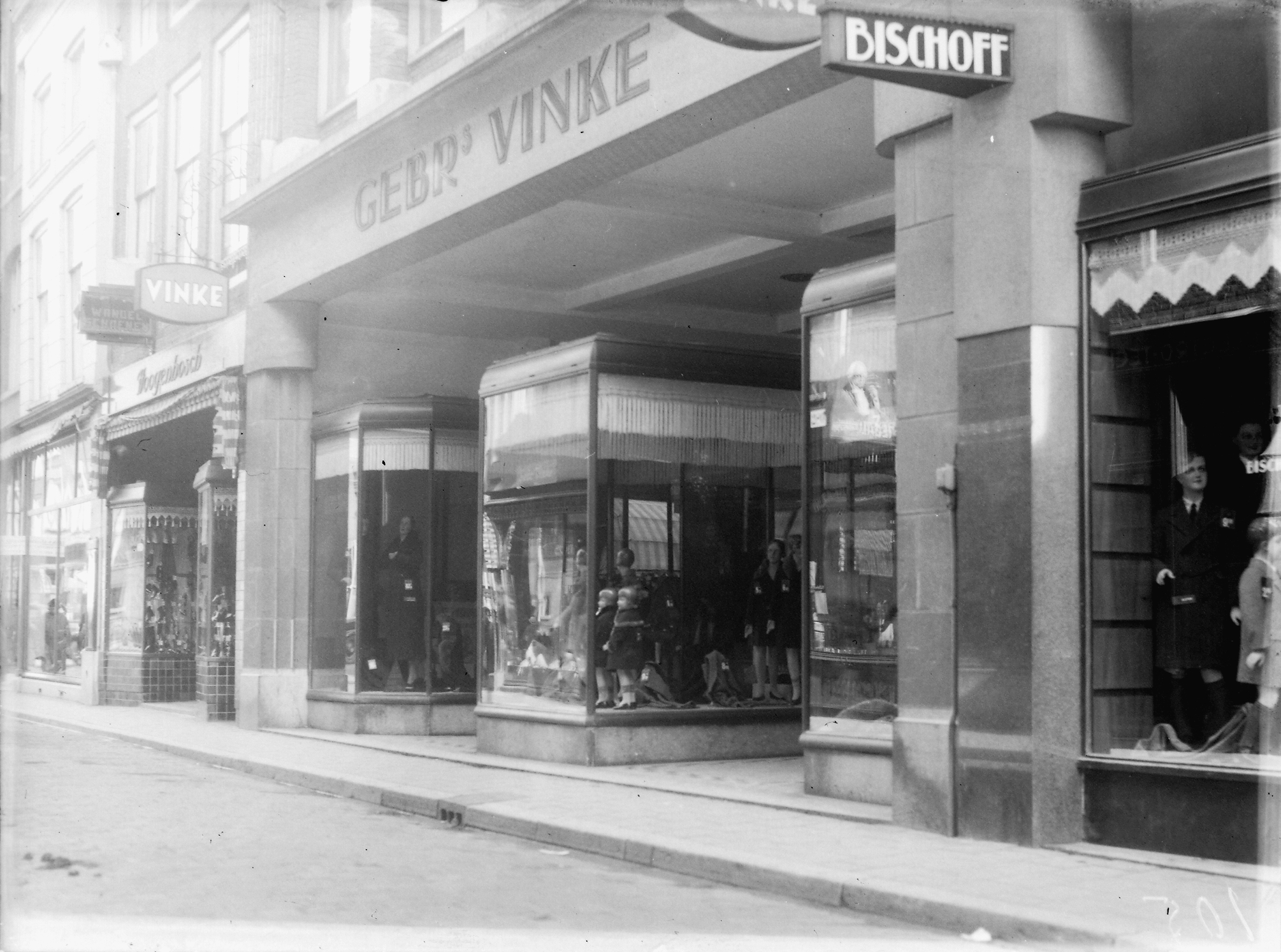 - Rij winkels in de Voorstraat tussen Lombardstraat en Visstraat. V.l.n.r. schoenenzaak Hoogenbosch, Vinke damesmode en Bischoff herenmode.