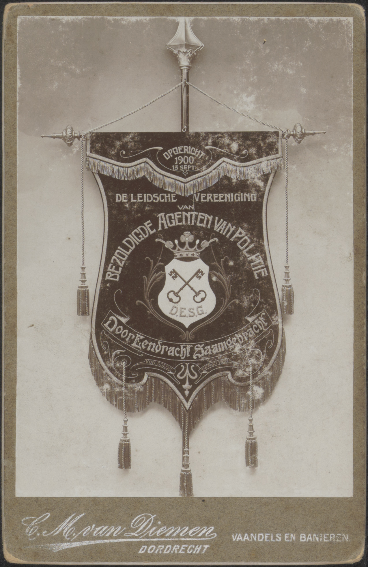 - Een vaandel van de Leidsche Vereeniging van bezoldigde agenten van Politie "Door Eendracht Saamgebracht", opgericht 13 september 1900.