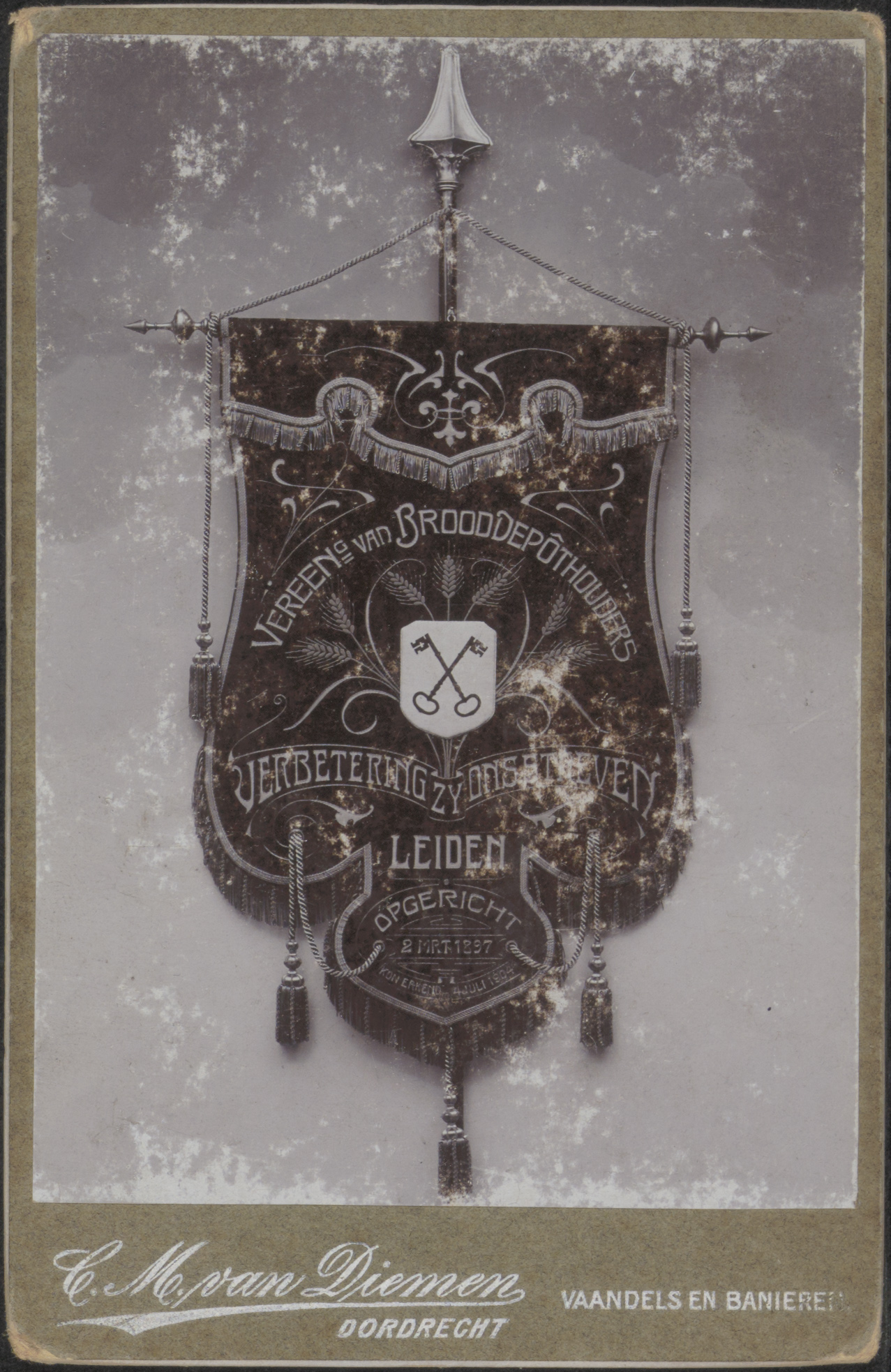 - Een vaandel van de Vereeniging van brooddepothouders "Verbetering zij ons Streven" te Leiden; opgericht 2 maart 1897.