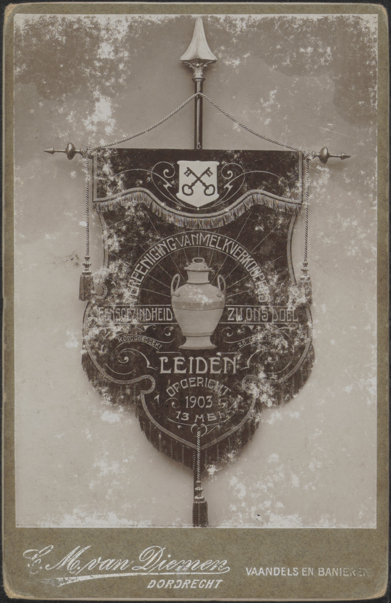 Een vaandel van de Vereeniging van Melkverkopers "Eensgezindheid zij ons Doel", te Leiden; opgericht 13 mei 1903.
