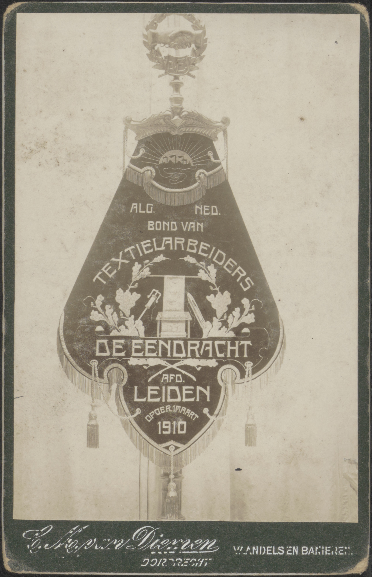 - Een vaandel van de Algemene Nederlandsche Bond van Textielarbeiders "De Eendracht, afd. Leiden; opgericht 1 maart 1910.