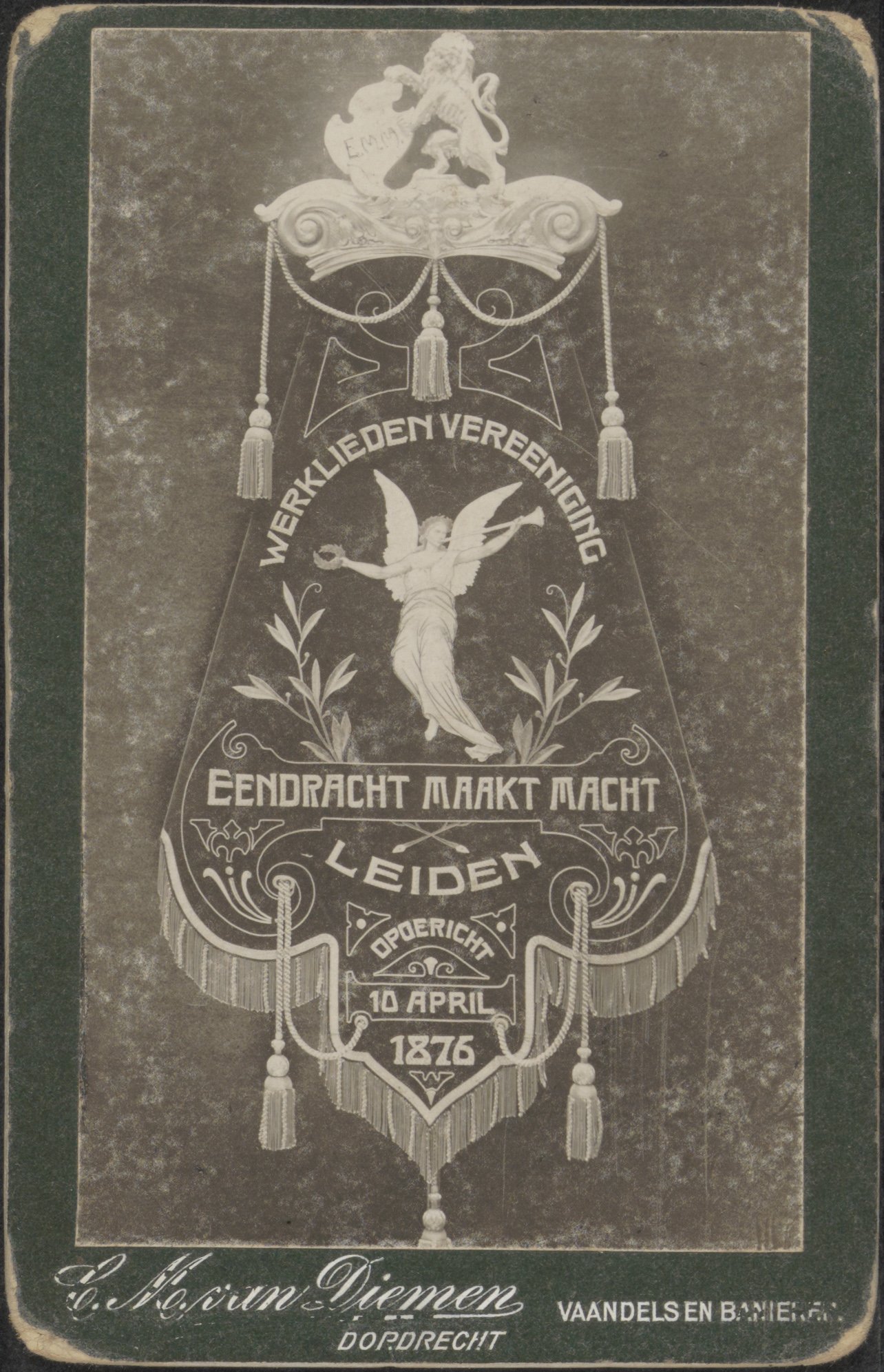- Een vaandel van de Werklieden Vereeniging "Eendracht maakt Macht" te Leiden; opgericht 10 april 1876.