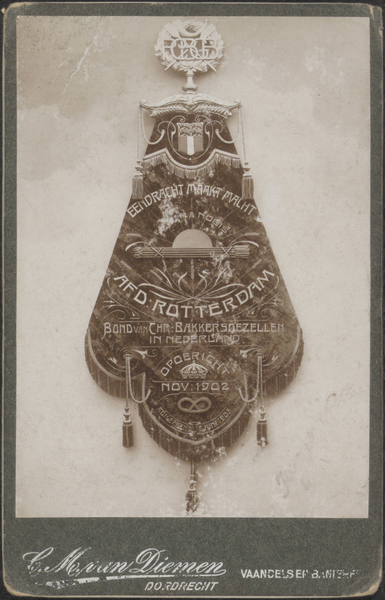 - Een vaandel van de Christelijke Bakkersgezellen in Nederland afd. Rotterdam "Eendracht Maakt Macht", opgericht november 1902; koninklijk erkend 6 juni 1903.