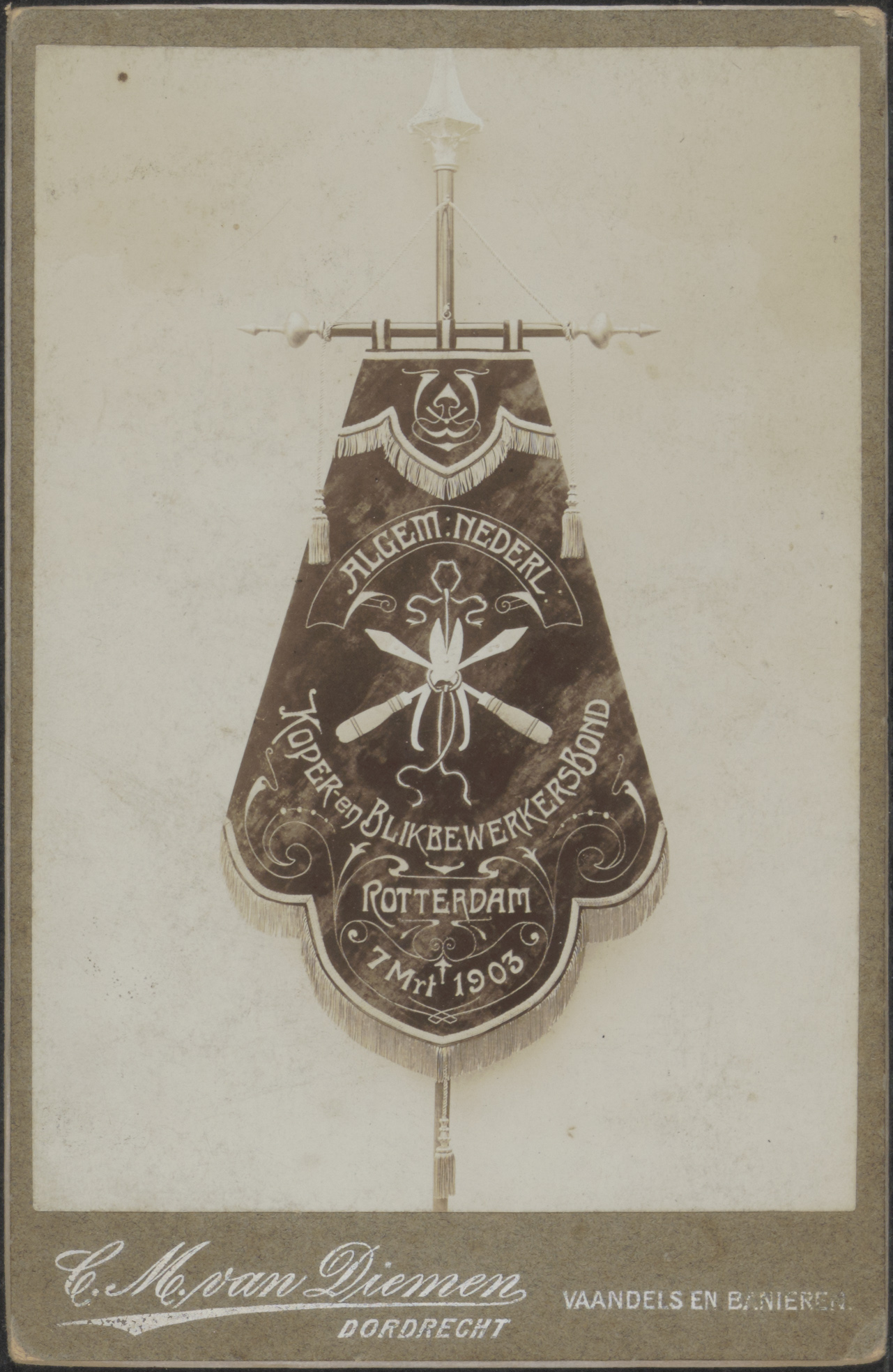 - Een vaandel van de Algemene Nederlandsche Koper- en Blikbewerkersbond te Rotterdam; opgericht 7 maart 1903.