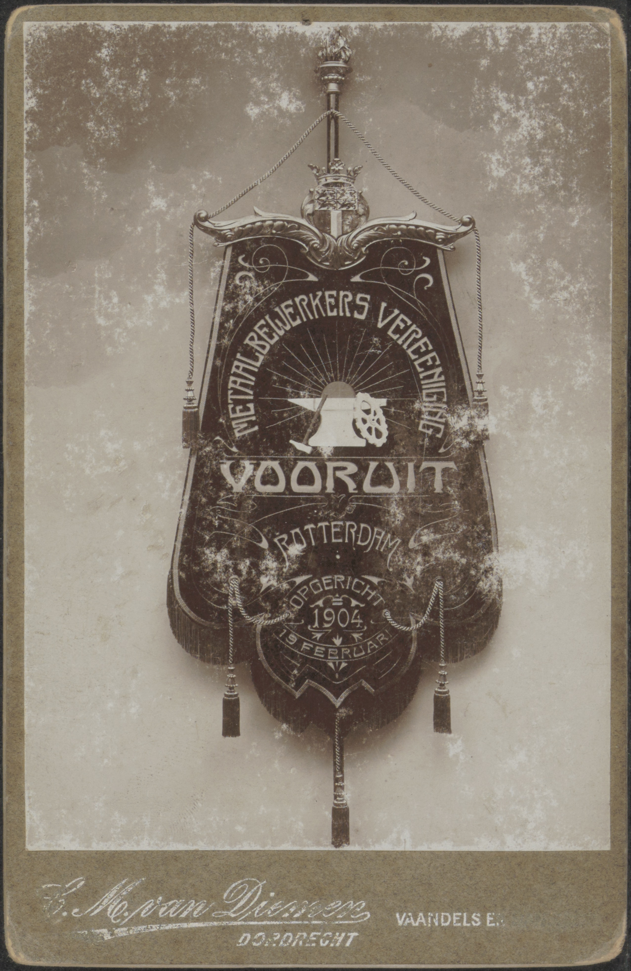 - Een vaandel van de Metaalbewerkers Vereeniging "Vooruit" te Rotterdam; opgericht 19 februari 1904.