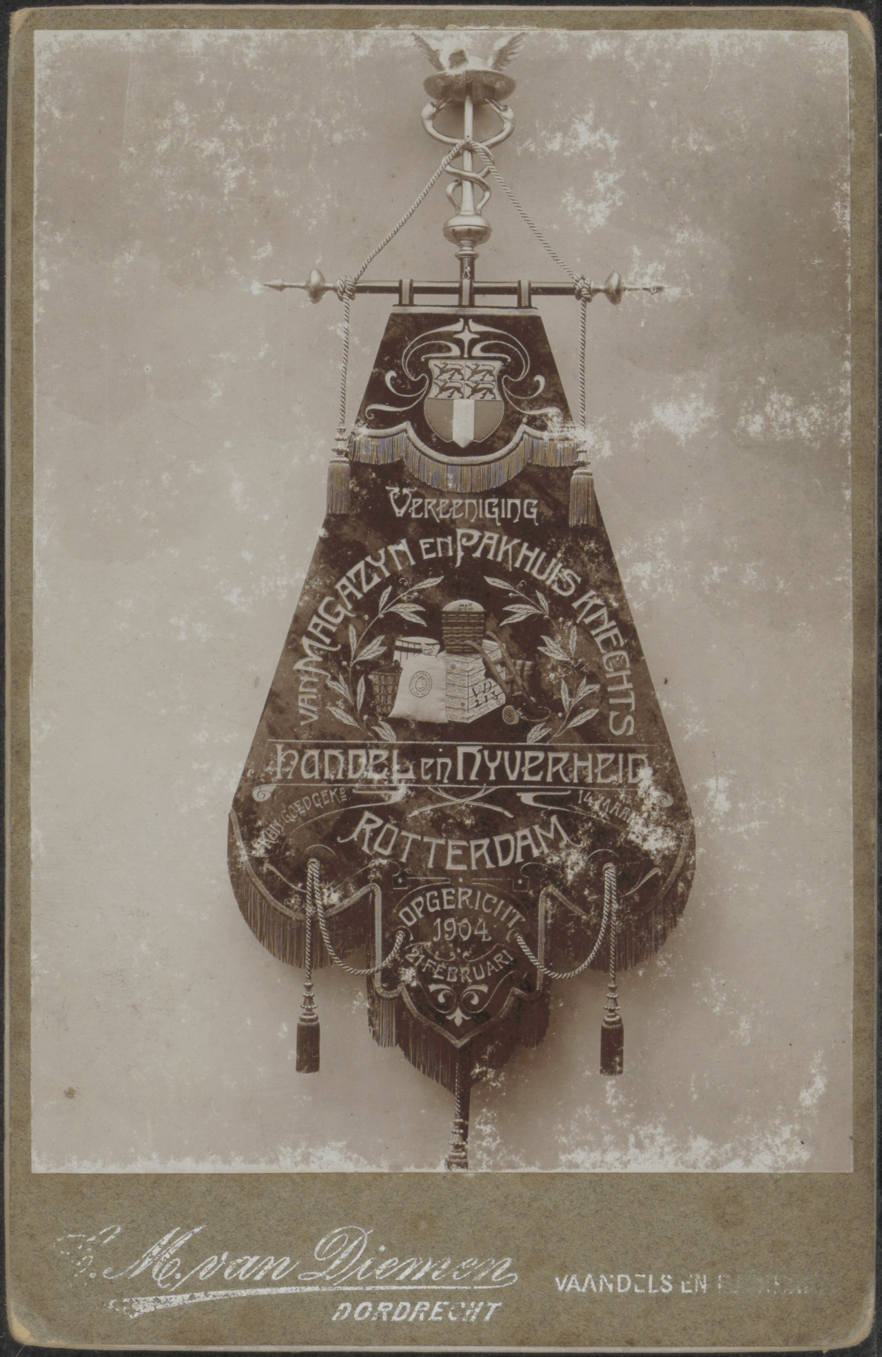- Een vaandel van de Vereeniging van Magazijn en Pakhuisknechten "Handel en Nijverheid" te Rotterdam; opgericht 21 februari 1904.