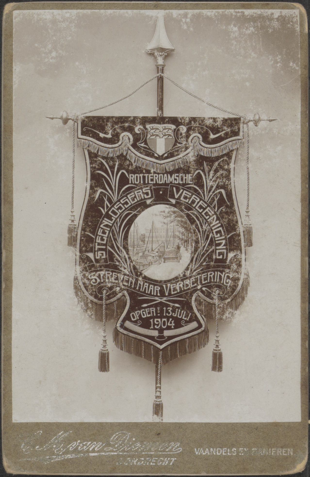 - Een vaandel van de Rotterdamsche Steenlossers - Vereeniging "Streven naar Verbetering" opgericht 13 juli 1904.