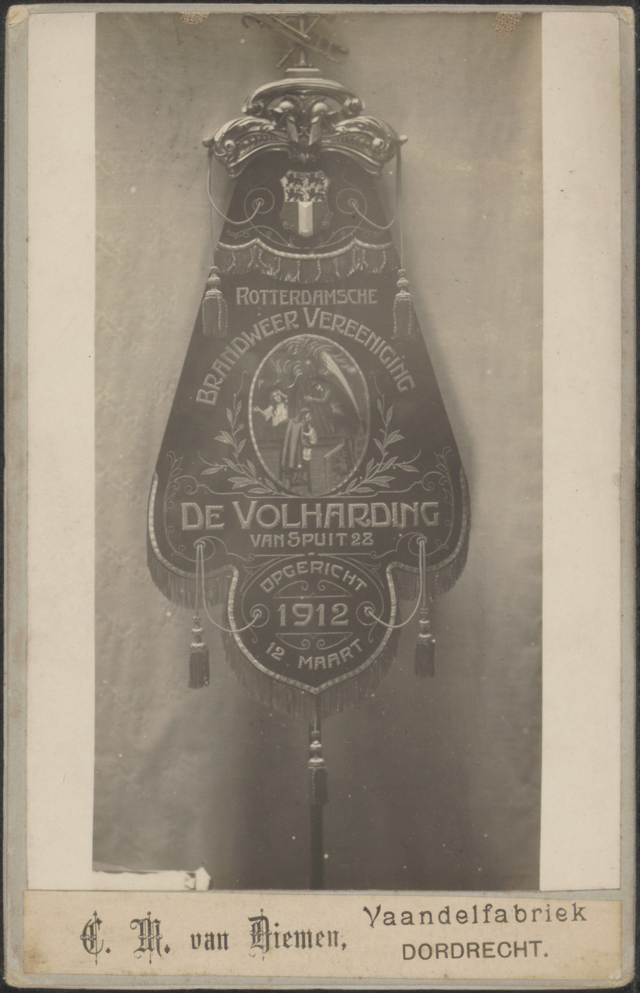 - Een vaandel van de Rotterdamsche Brandweervereeniging "De Volharding" van Spuit 28; opgericht 12 maart 1912.