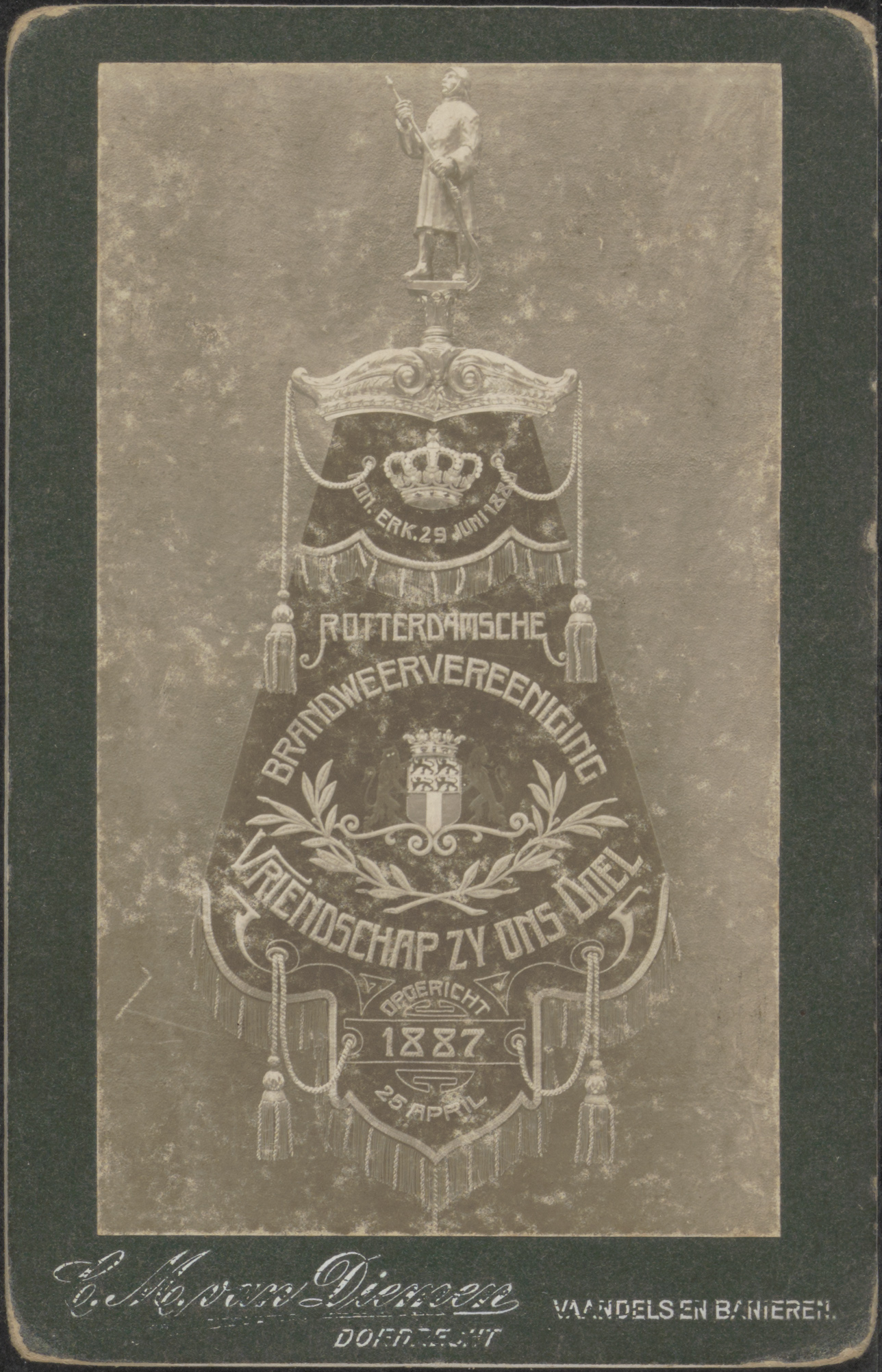 - Een vaandel van de Rotterdamsche Brandweervereeniging "Vriendschap Zij Ons Doel" opgericht 25 april 1887; koninklijk goedgekeurd 29 juni 1889.