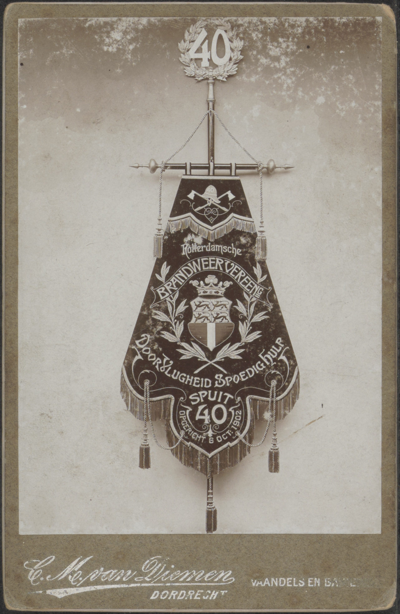 - Een vaandel van de Rotterdamsche Brandweervereeniging "Door Vlugheid - Spoedig Hulp" Spuit 40, opgericht 6 oktober 1902.