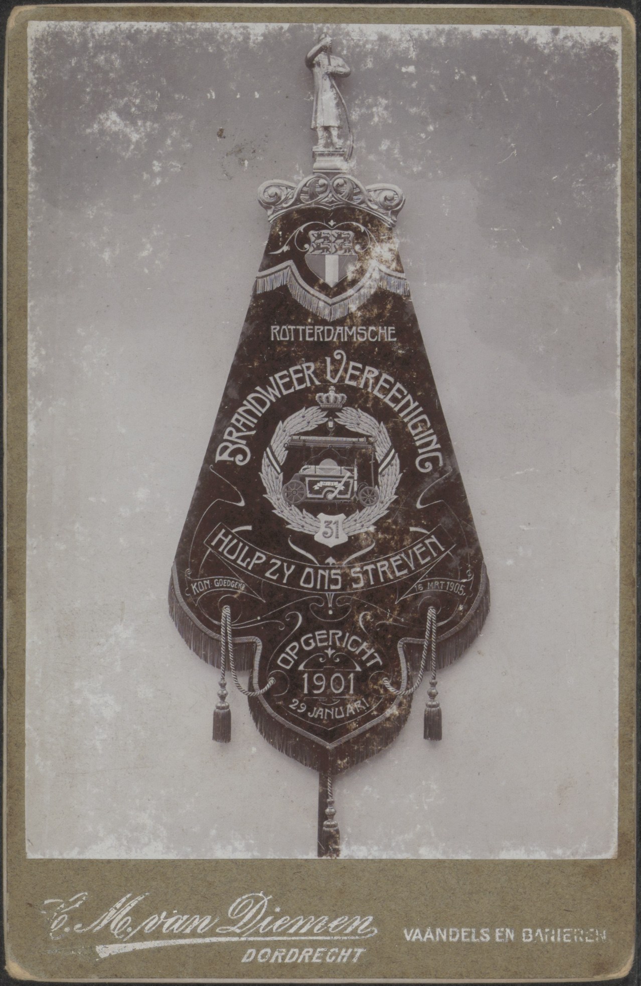 - Een vaandel van de Rotterdamsche Brandweervereeniging "Hulp Zij Ons Streven" Spuit 31; opgericht 29 januari 1901.