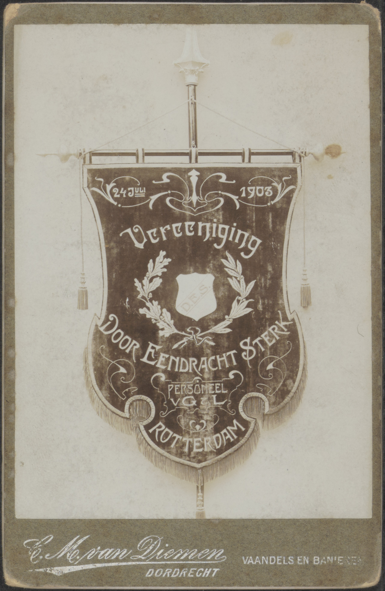 - Een vaandel van de Vereeniging "Door Eendracht - Sterk" Opgericht 24 juli 1903; personeel van Van G. en L. Rotterdam.