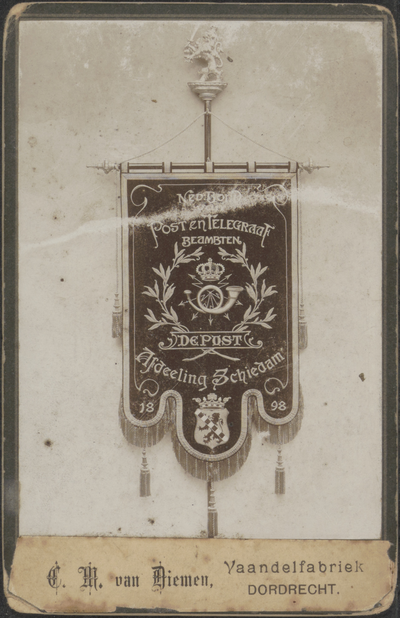 - Een vaandel van de Nederlandsche Bond van Post- en Telegraafbeambten "De Post" afd. Schiedam, 1898.