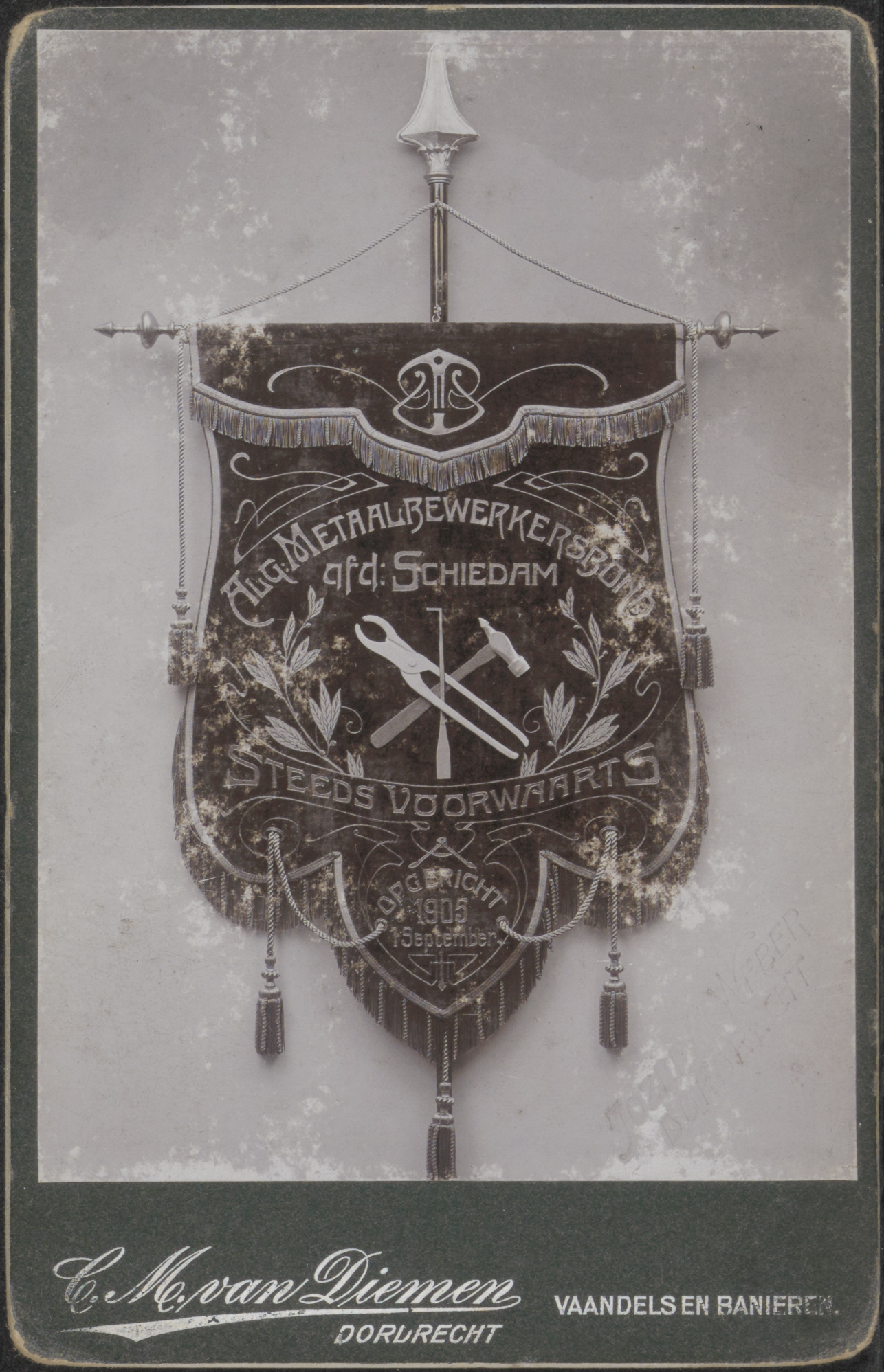 - Een vaandel van de Algemeene Metaalbewerkersbond "Steeds Voorwaarts" afd. Schiedam, opgericht 1 september 1905.