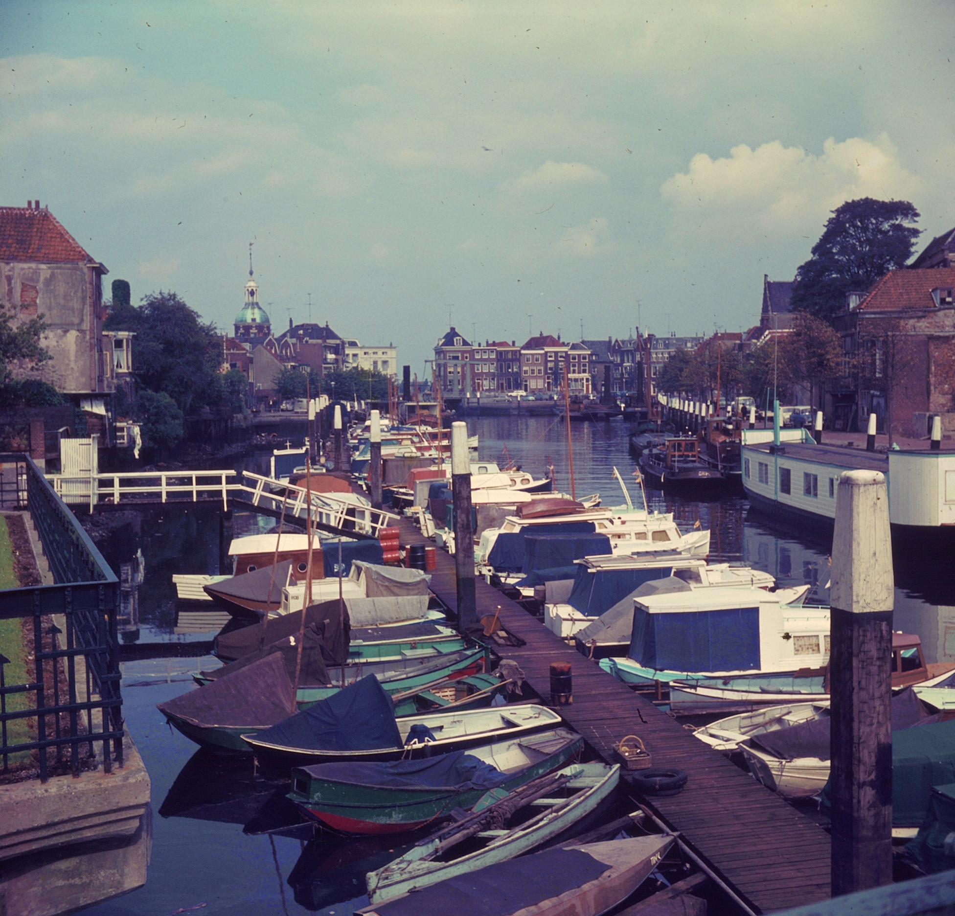 - De Wijnhaven met geheel rechts een woonboot, vooraan aan de linkerkant van het vlot wat kleinere bootjes, rechts van het vlot de motorbootjes. Geheel links is nog net de balustrade te zien die dient als afrastering van de tuin van het hoekhuis, dat aan de Wijnstraat staat. In de verte de Groothoofdstoren en de Boombrug, rechts de Taankade.
