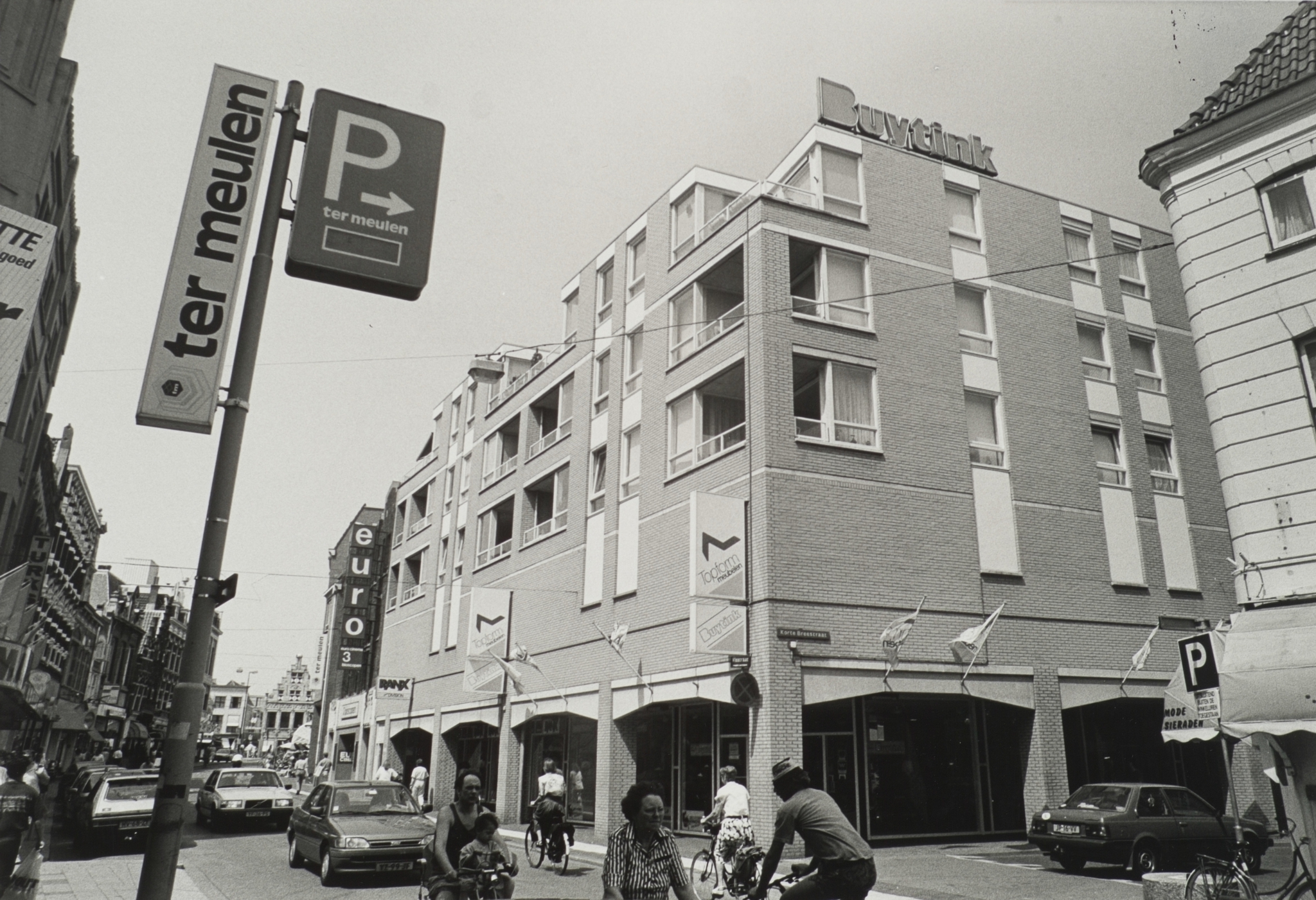 - Nieuwbouw aan de Visstraat kruising Korte Breestraat met de, na de brand, vernieuwde winkel van woninginrichting Buytink en de bioscoop (hier Euro voorheen Luxor)