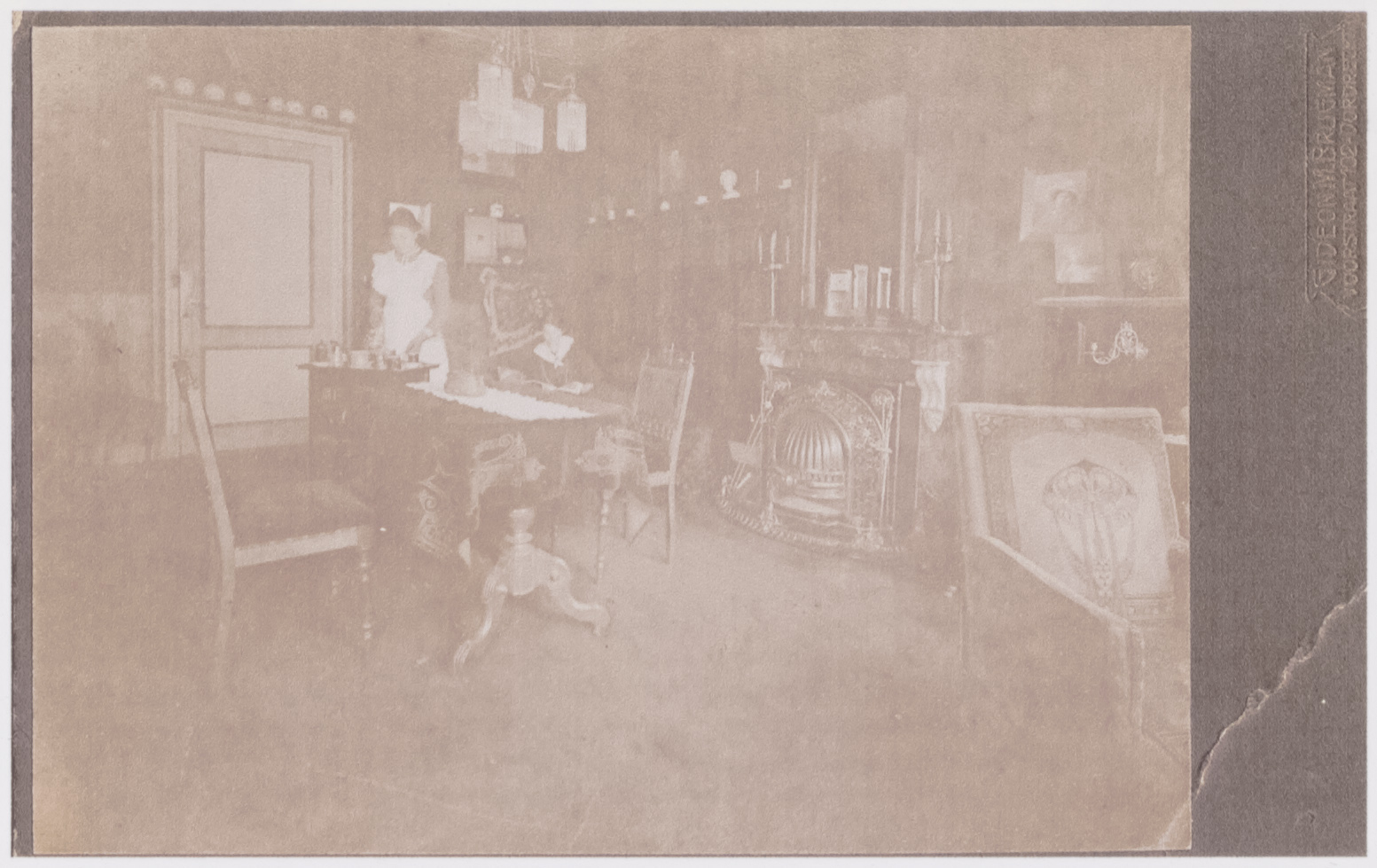 - Huiskamer boven bij fotoatelier Brugman aan de Voorstraat 102 (nu 138). de dame met het witte schort is onbekend