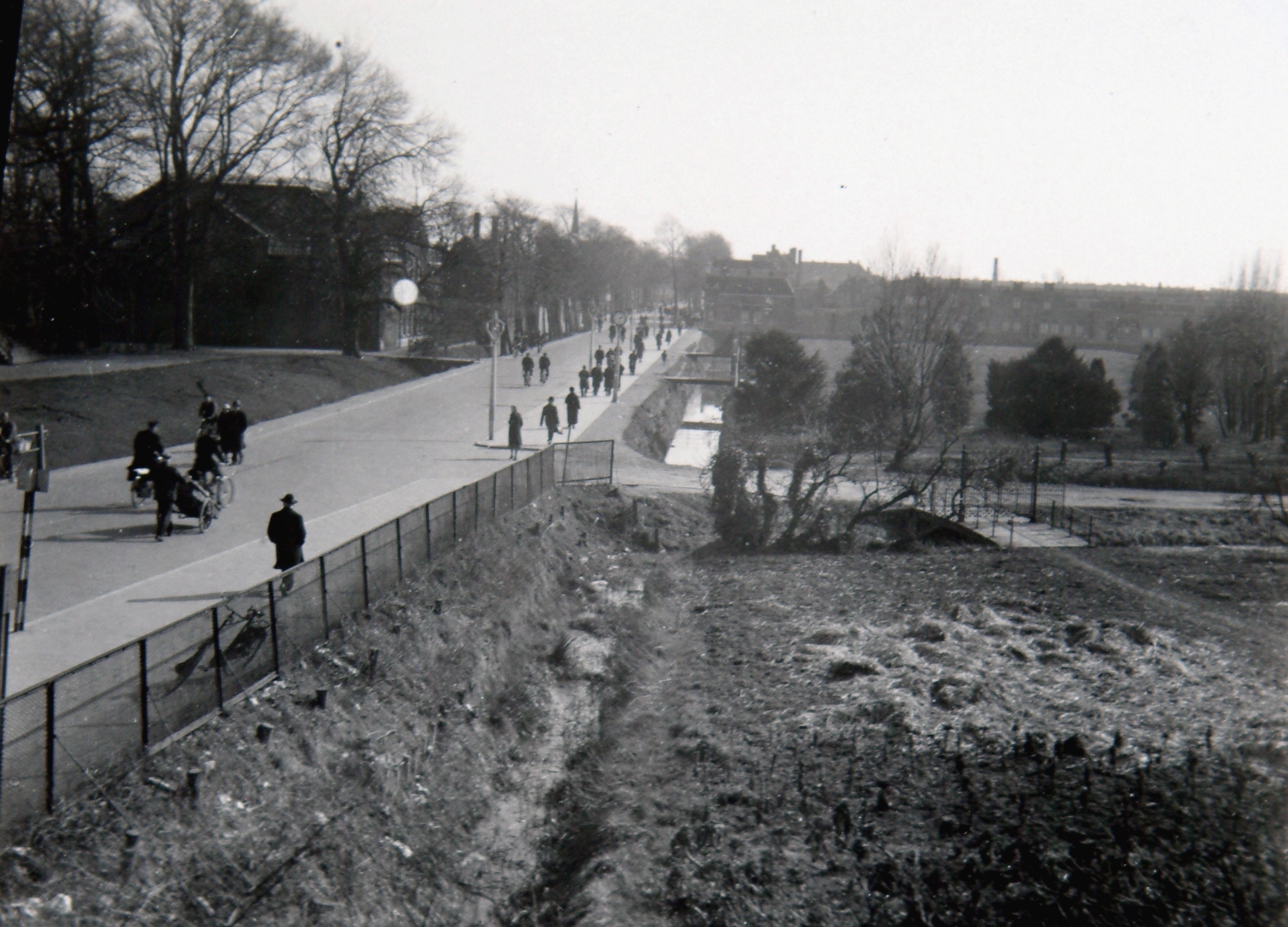 Gezicht op de Krispijnseweg in zuidelijke richting vanaf de voetgangersbrug over het …