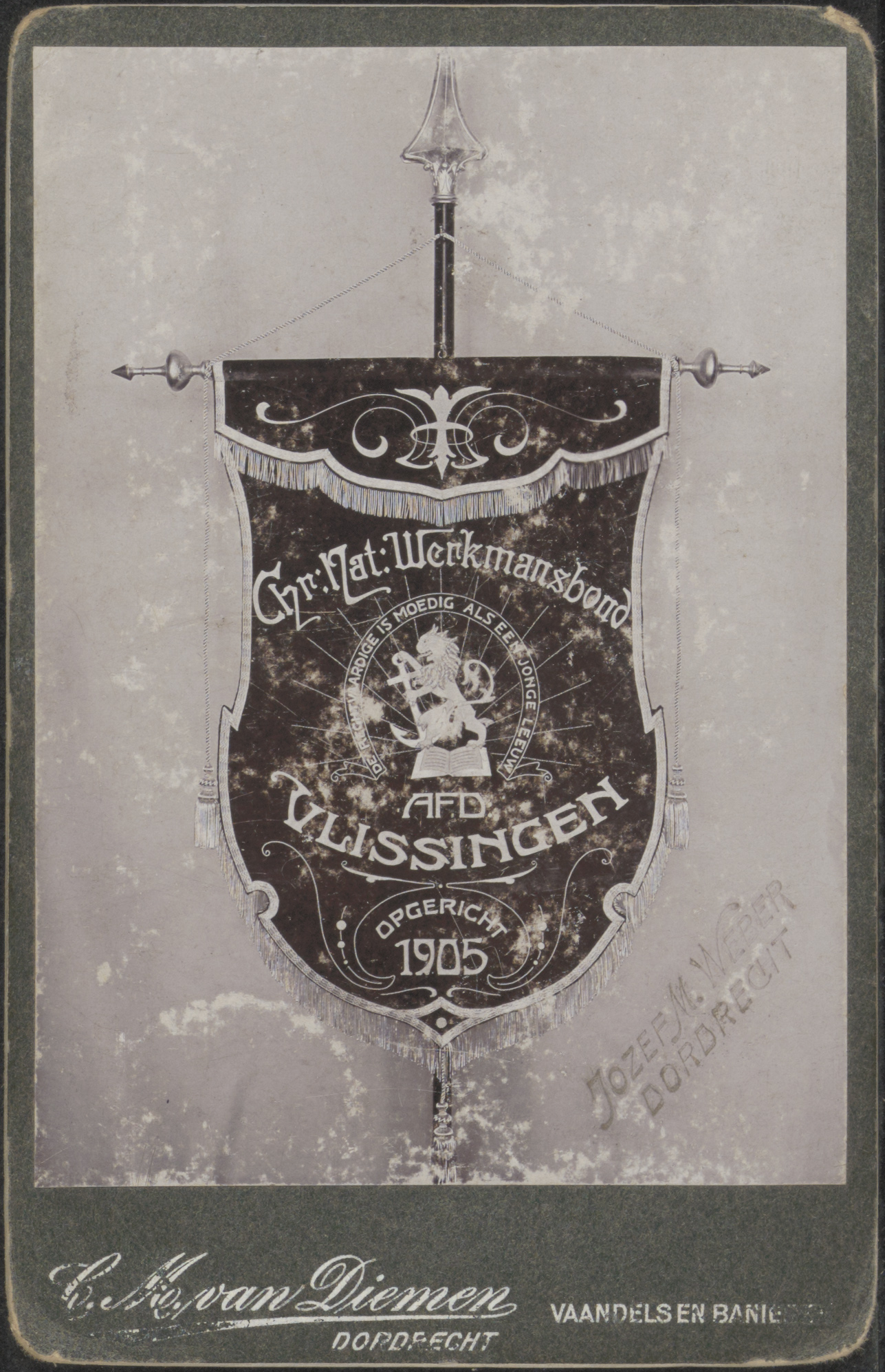 - Een vaandel van de Christelijke Nationale Werkmansbond, afd. Vlissingen (De rechtvaardige is moedig als een jonge leeuw); opgericht 1905.