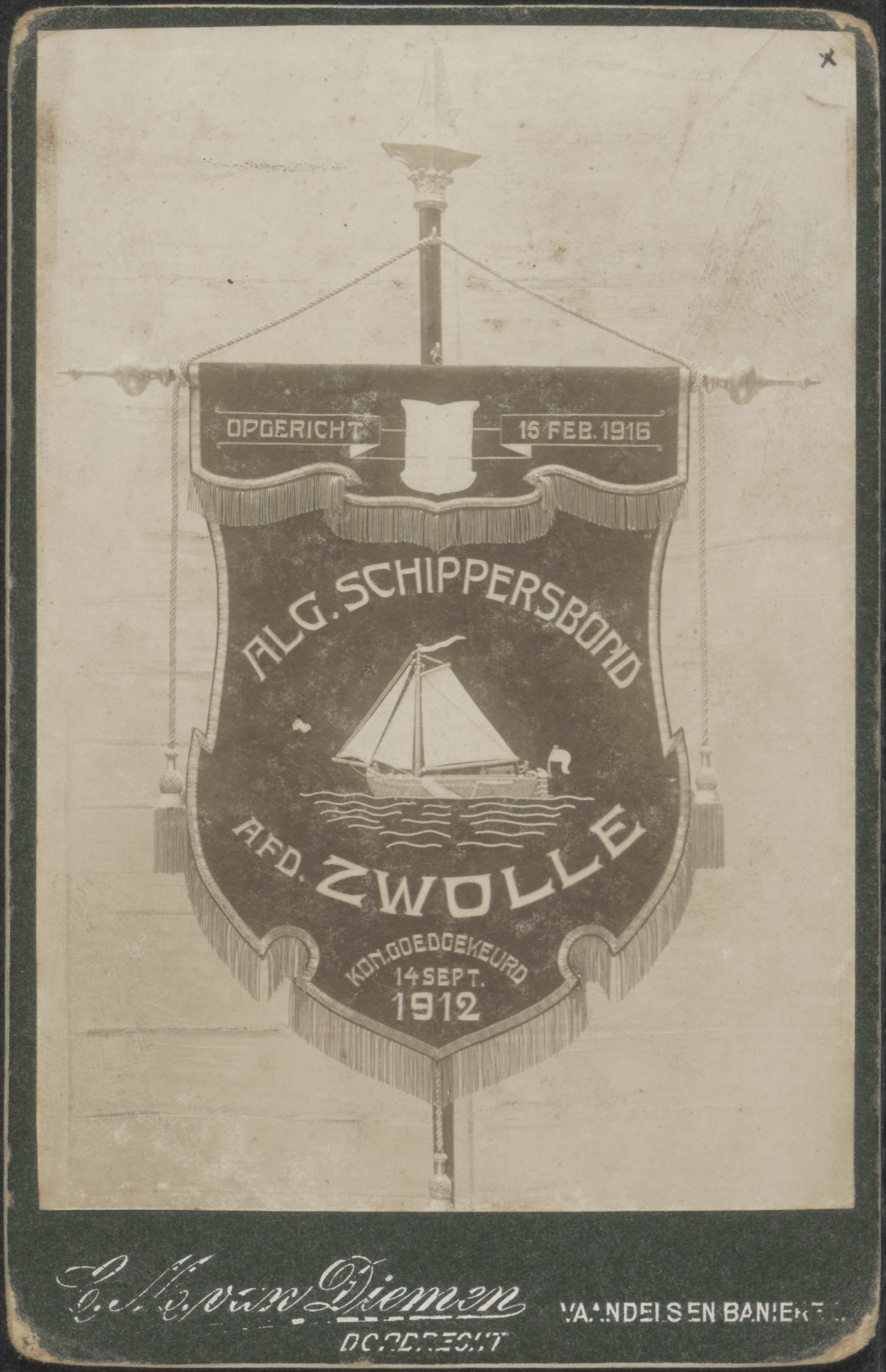 - Een vaandel van de Algemeene Schippersbond, afd. Zwolle opgericht 15 februari 1916, koninklijk goedgekeurd 14 september 1912.