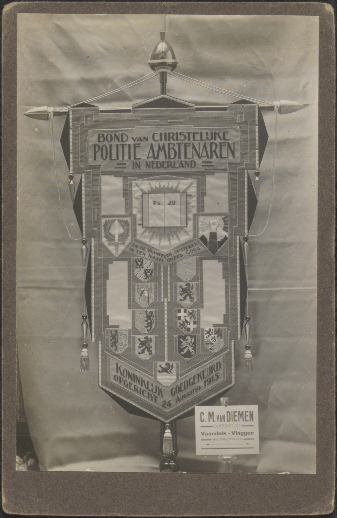 - Een vaandel van de Bond van Christelijke Politie Ambtenaren in Nederland, opgericht 24 augustus 1915, koninklijk goedgekeurd 1915.