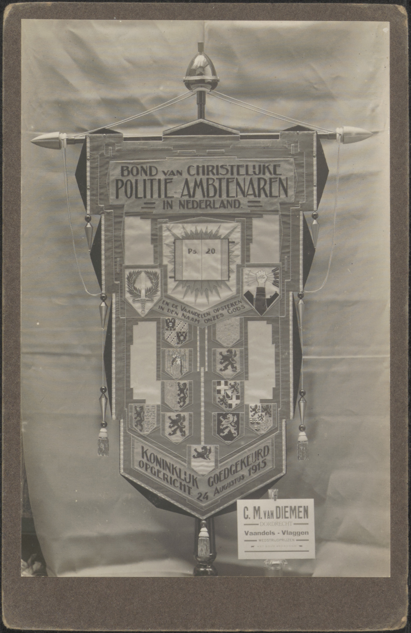- Een vaandel van de Bond van Christelijke Politieambtenaren in Nederland, opgericht 24 augustus 1915, koninklijk goedgekeurd.