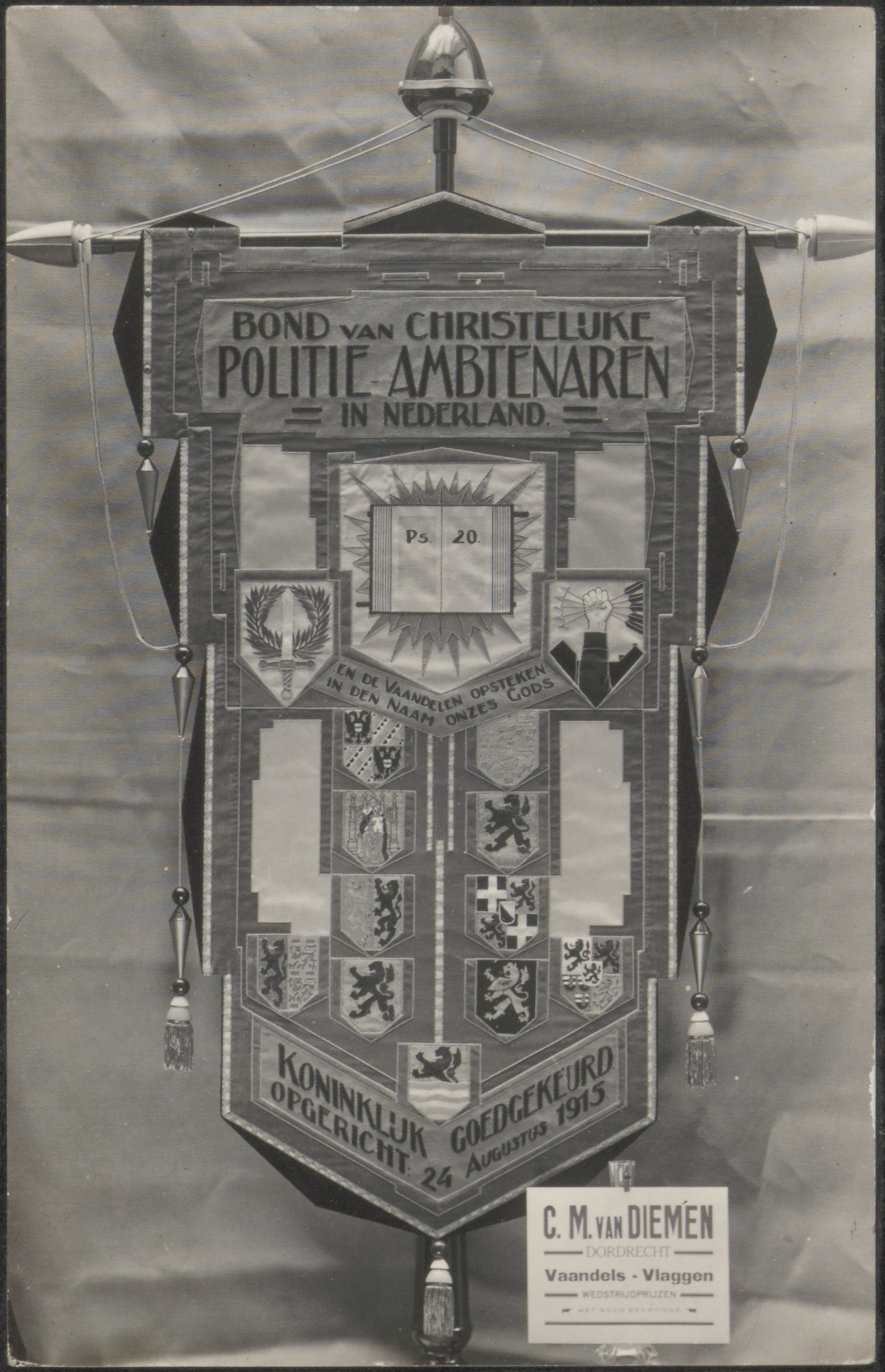 - Een vaandel van de Bond van Christelijke Politie Ambtenaren in Nederland, opgericht 24 augustus 1915, koninklijk goedgekeurd.