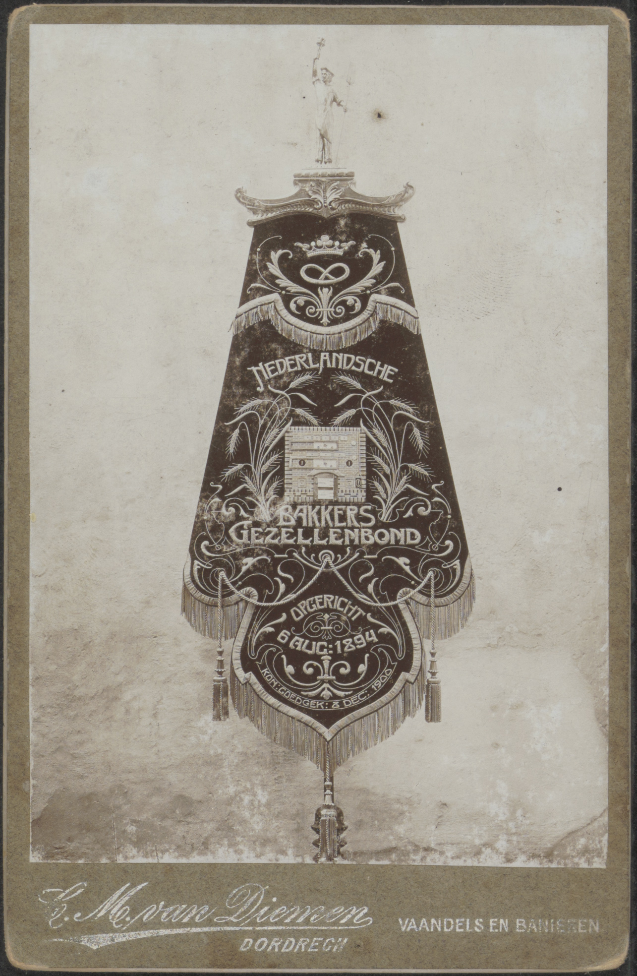 - Een vaandel van de Nederlandsche Bakkersgezellenbond, opgericht 6 augustus 1894, koninklijk goedgekeurd 8 december 1900.