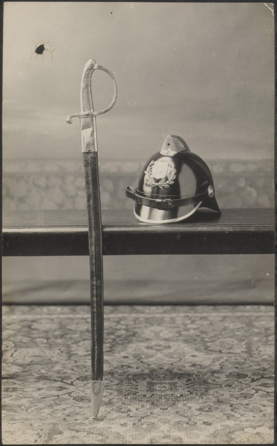 - Een politiehelm en sabel van de politie te Dordrecht.