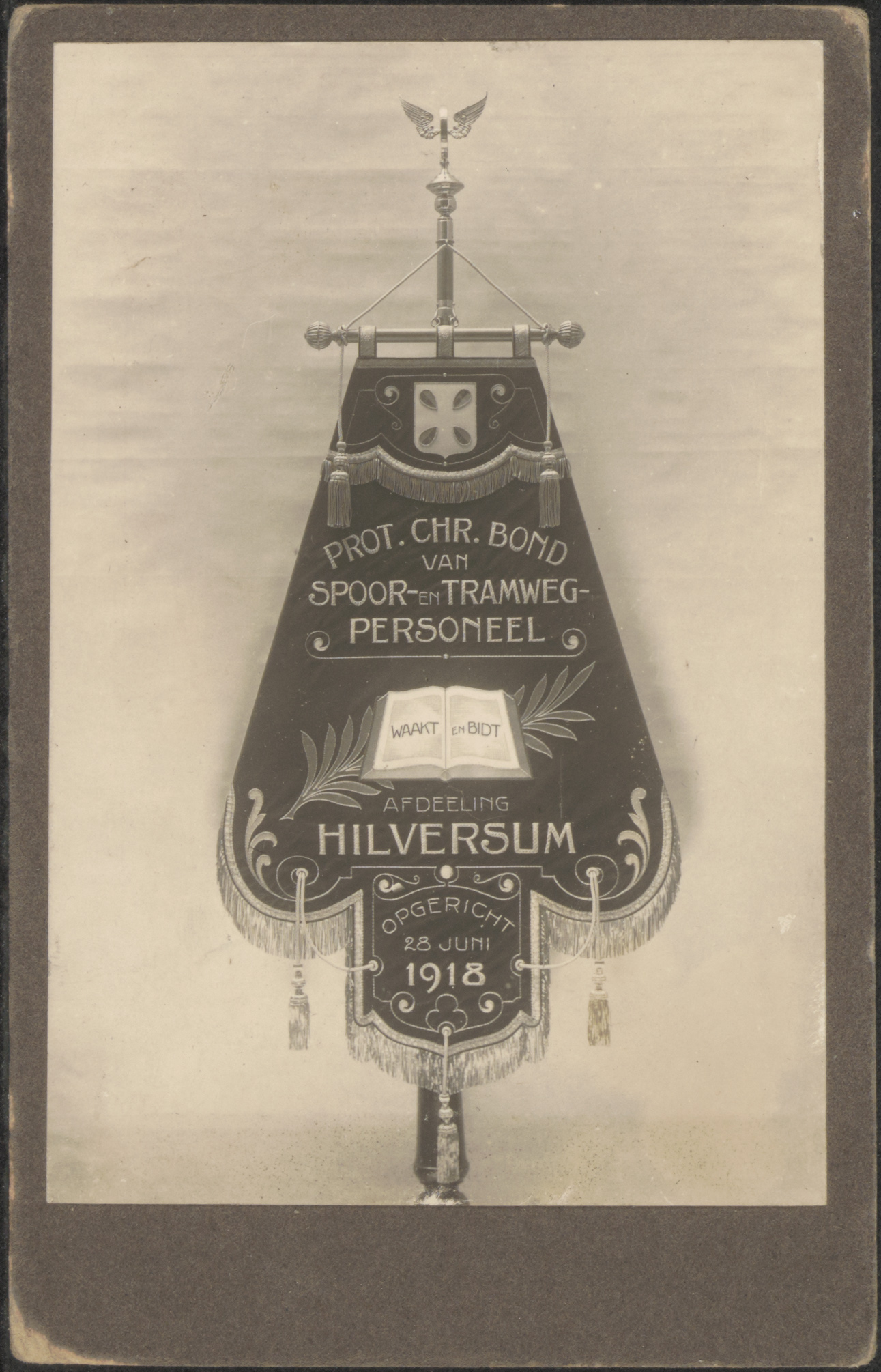 - Een vaandel van de Protestants Christelijke Bond van Spoor- en Tramwegpersoneeel afd. Hilversum, opgericht 28 juni 1918.