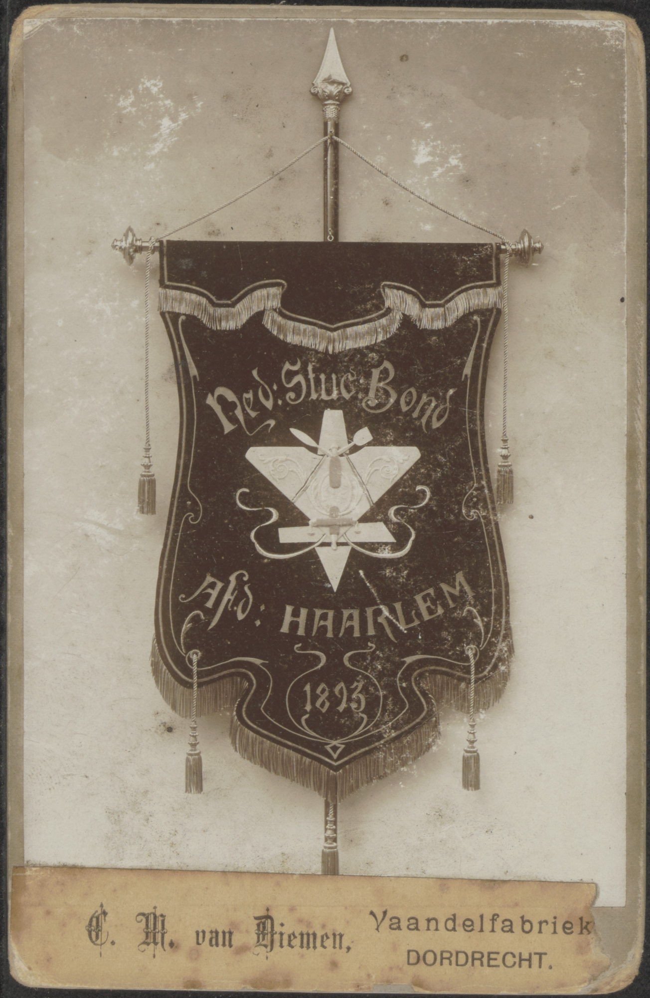 Een vaandel van de Nederlandsche Stuc. Bond afd. Haarlem, 1893.