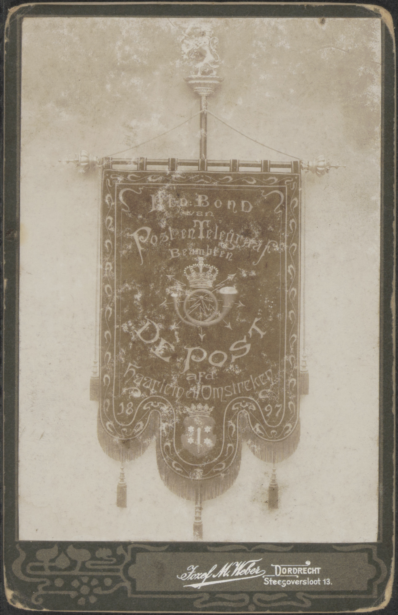 - Een vaandel van de Nederlandsche Bond van Post- en Telegraafbeambten "De Post" afd. Haarlem en omstreken, 1897.