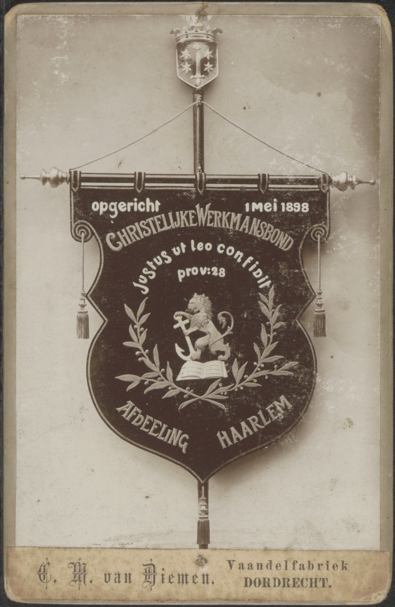 - Een vaandel van de Christelijke Werkmansbond "Justus - Ut - Leo - Confidit" afd. Haarlem, opgericht 1 mei 1898.